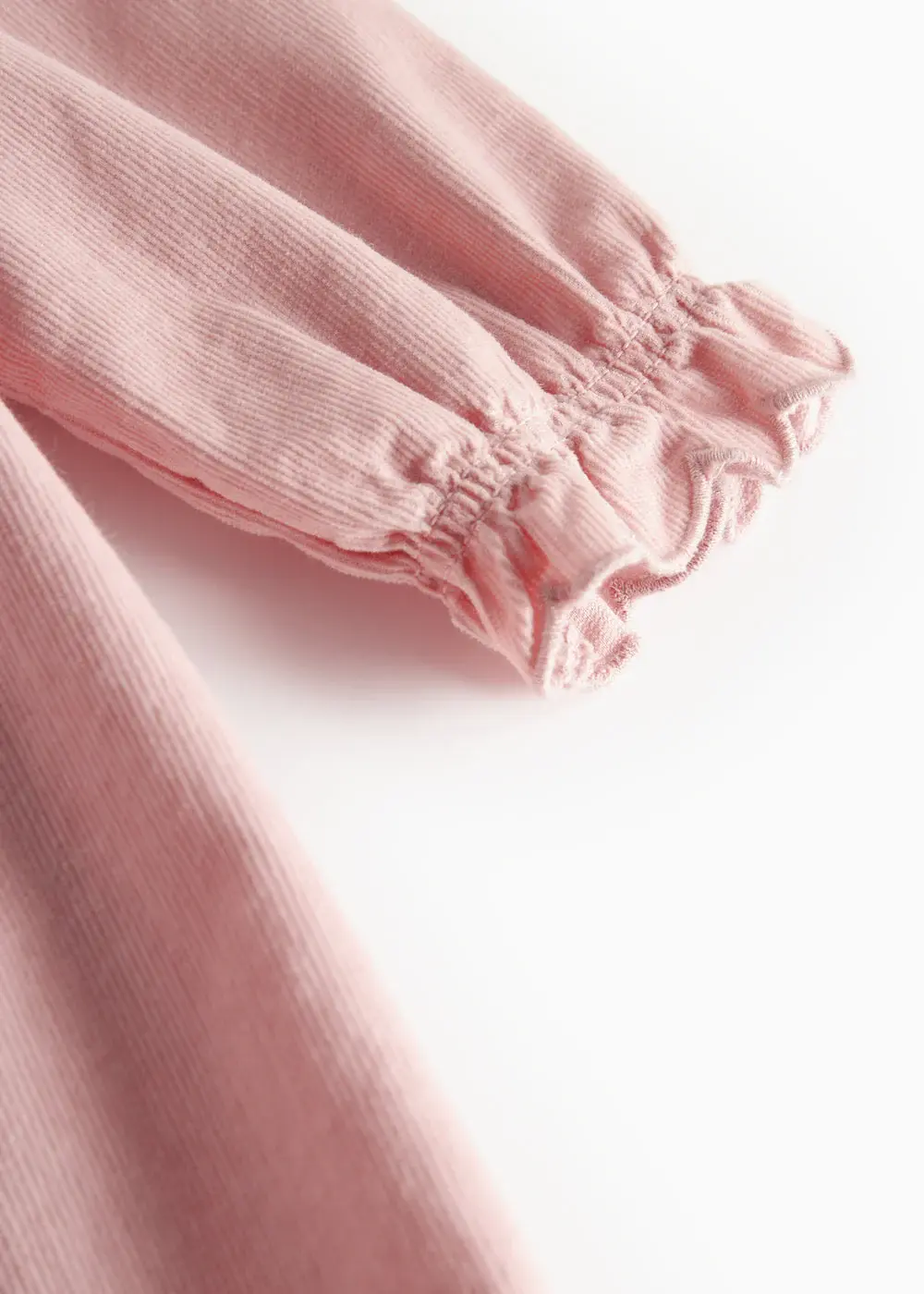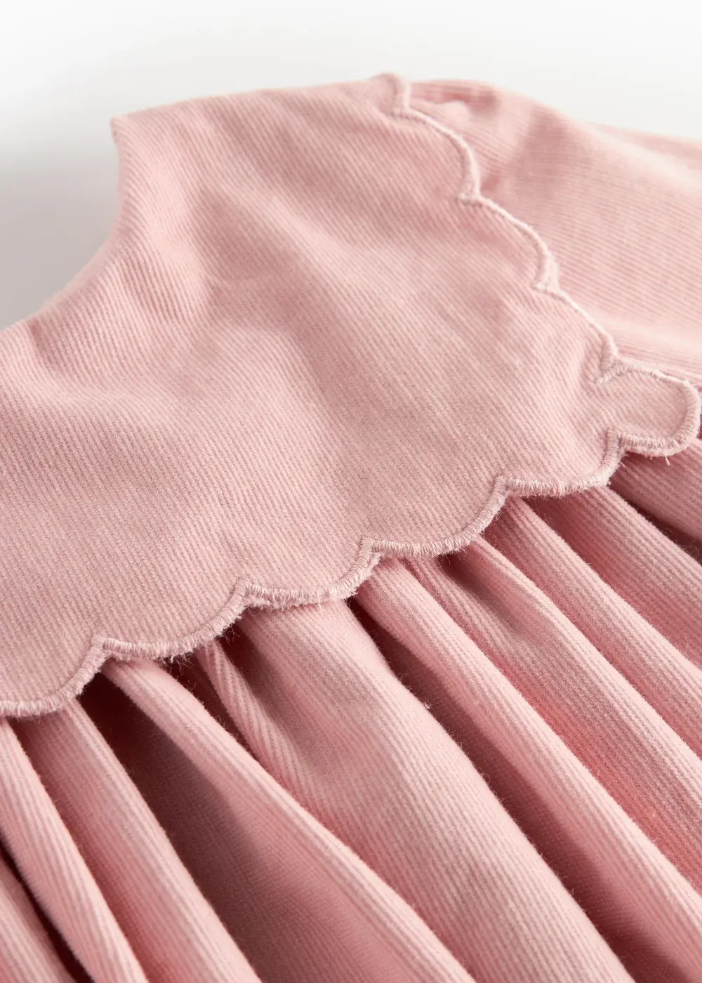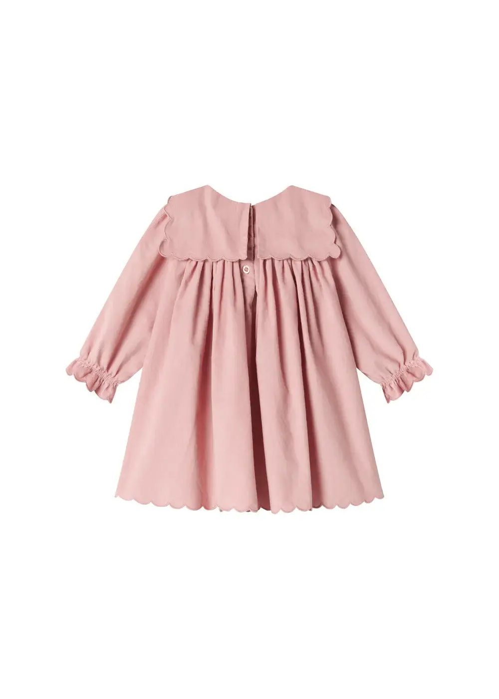 Long-sleeved dress for the little ones in baby velvet with a loose fit and a nice large decorative collar with wavy details. The dress has two pockets in the front and a button closure at the back. The length of the dress goes above the knee.