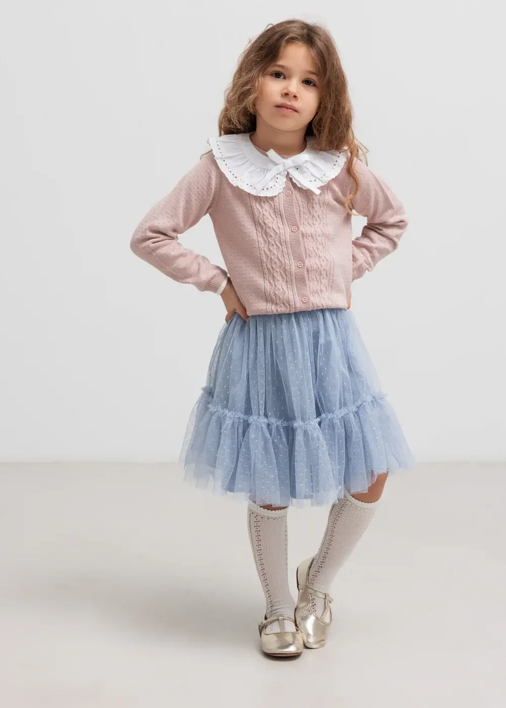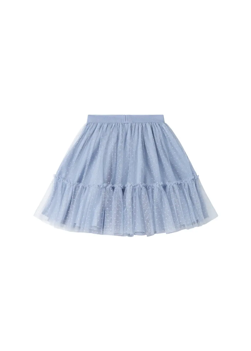 Skirt for children with lots of volume and beautiful tulle ruffles. The skirt is decorated with dots, has an elastic waist and cotton lining. The length of the skirt goes above the knee.