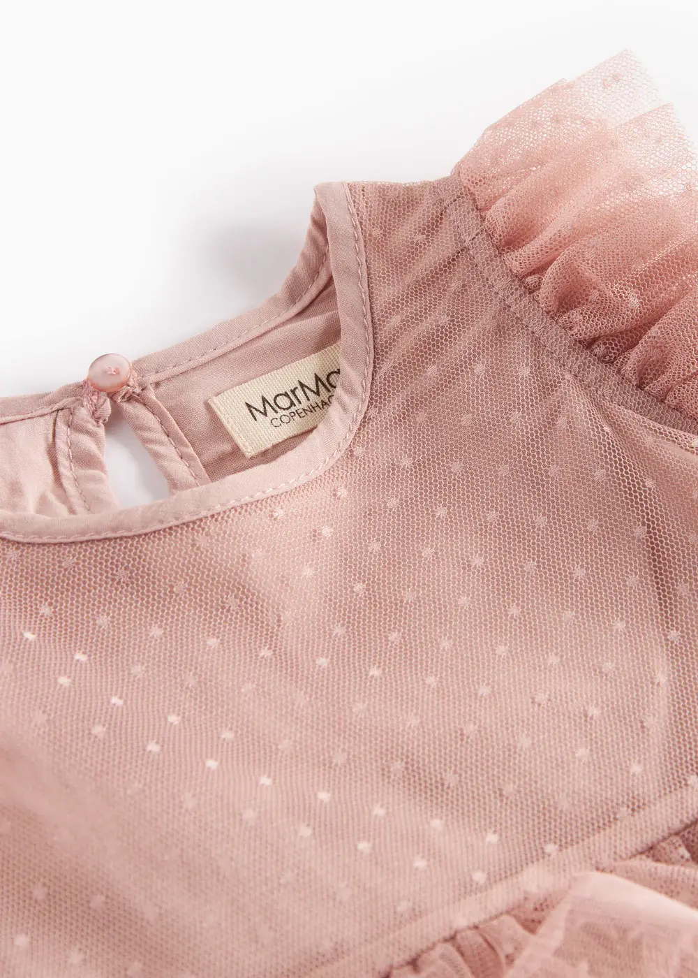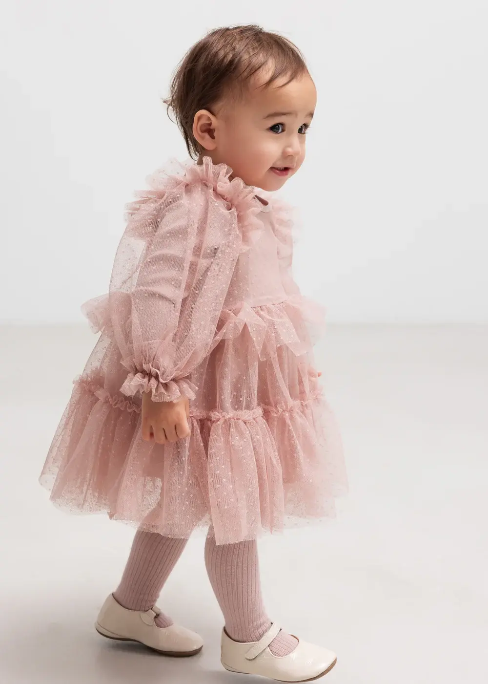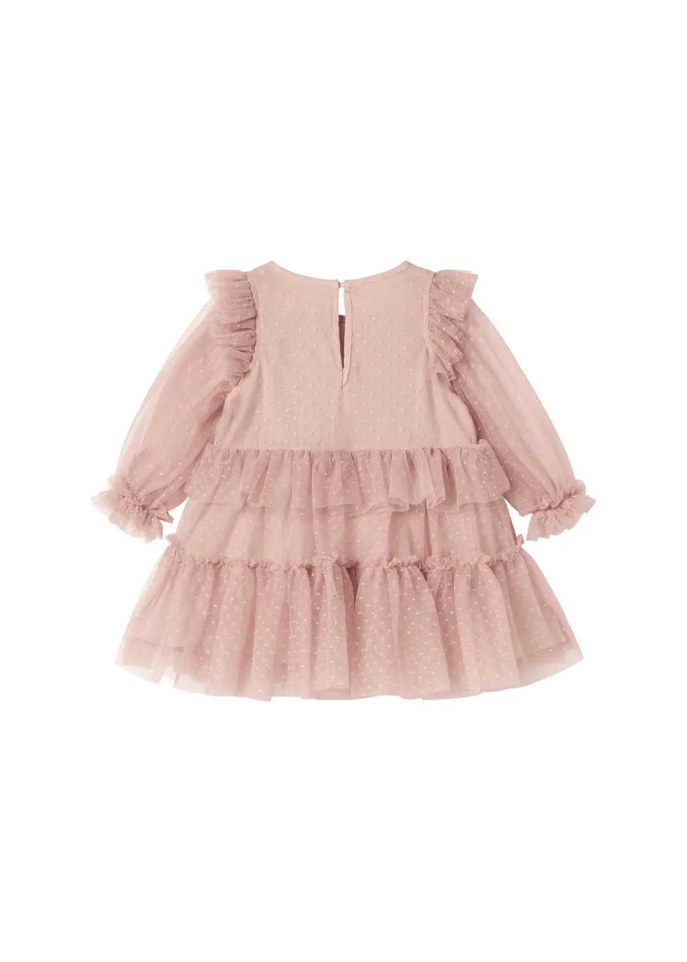 Long-sleeved dress for the little ones with lots of volume and beautiful tulle ruffles. The dress is decorated with dots and has a button closure at the back. The length of the dress goes above the knee.