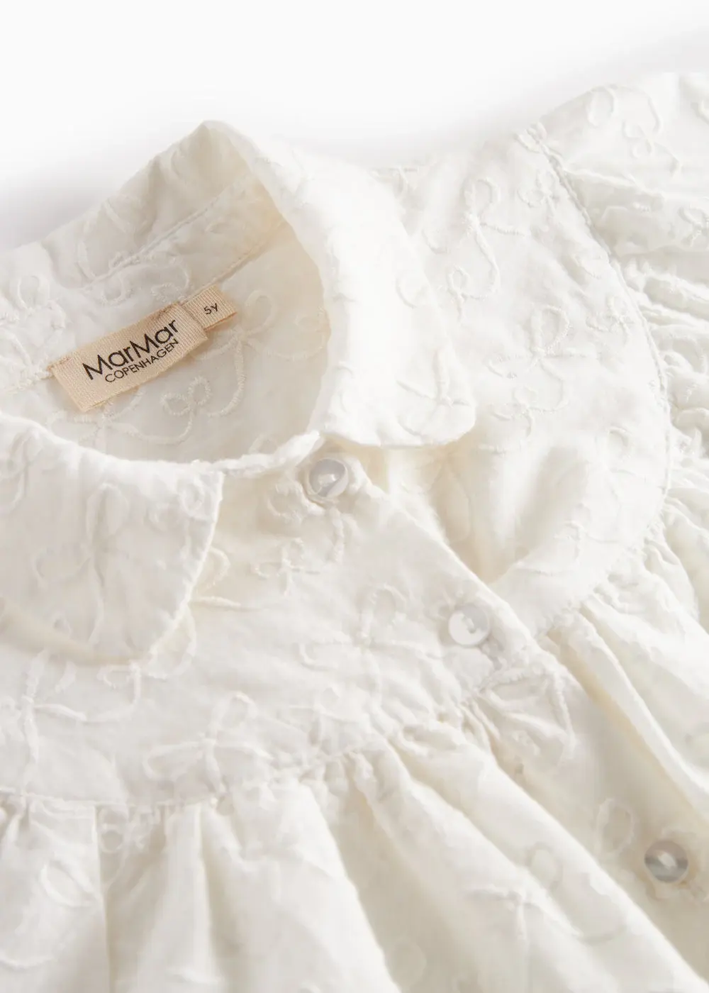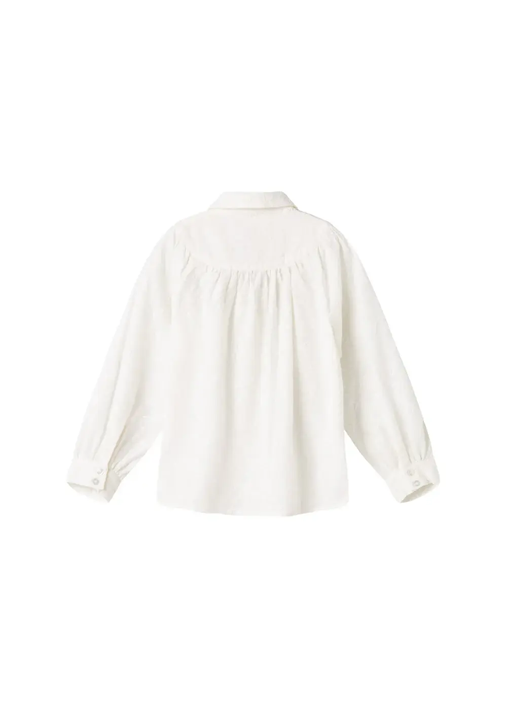 Children's shirt blouse in soft cotton with tone-on-tone embroidered bows. The shirt has long sleeves, a round yoke with a slight gather and a classic collar that adds a timeless look. Closes with small buttons at the front. An elegant style that is perfect for both everyday wear and special occasions.