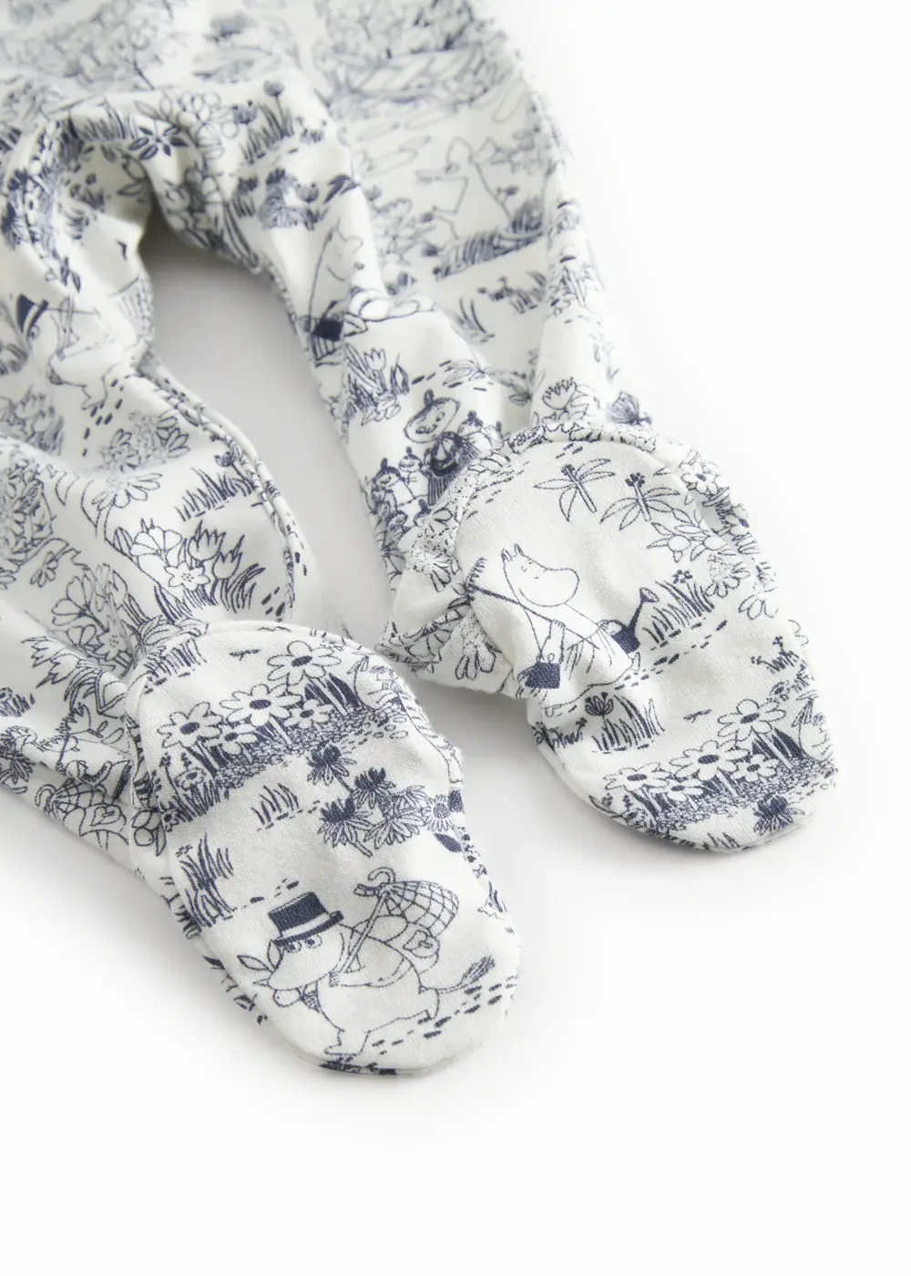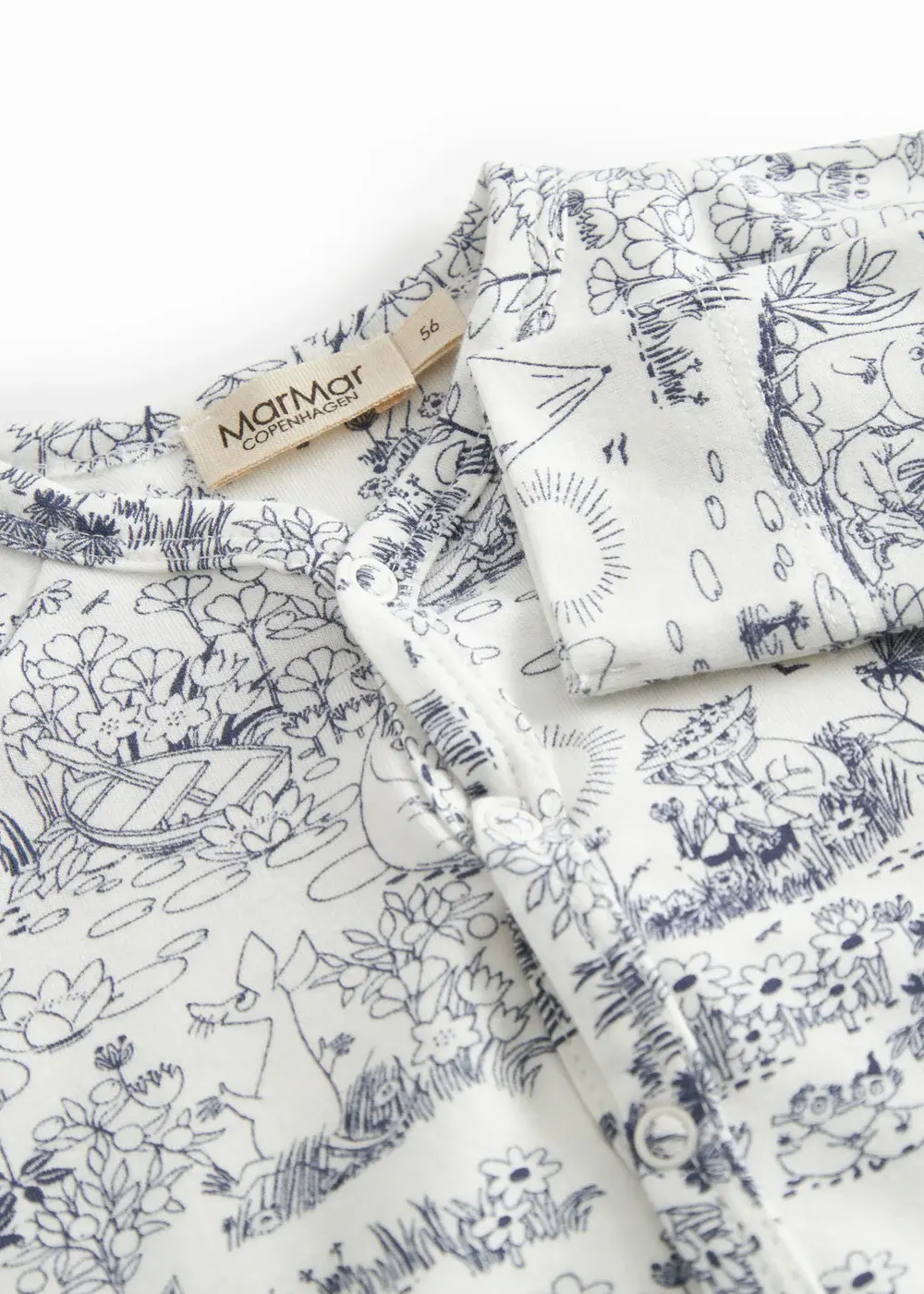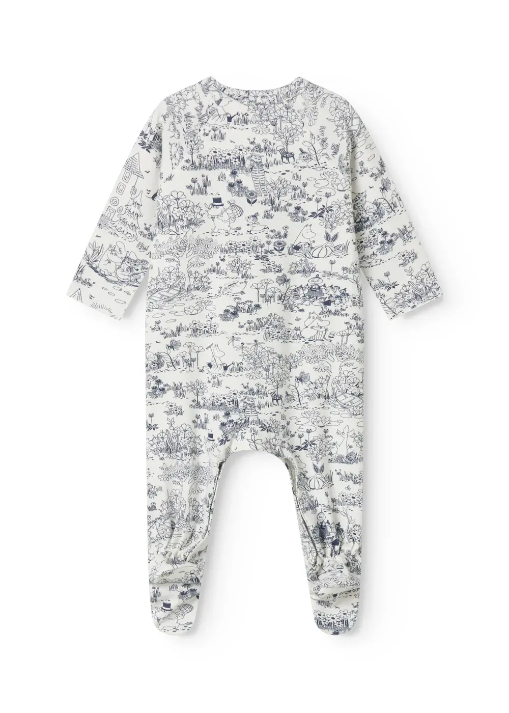 Simple long-sleeved romper with feet that can be buttoned all the way from the neck down both legs with snaps for easy diaper changes. The jumpsuit has a cute Moomin print and is both soft, holds its shape and color and has elastane in it which makes it stretchy and comfortable to wear.