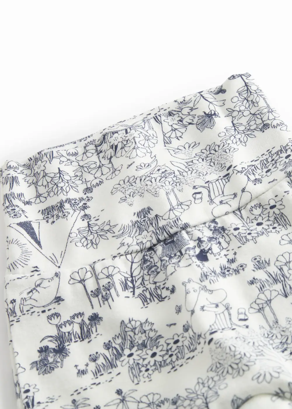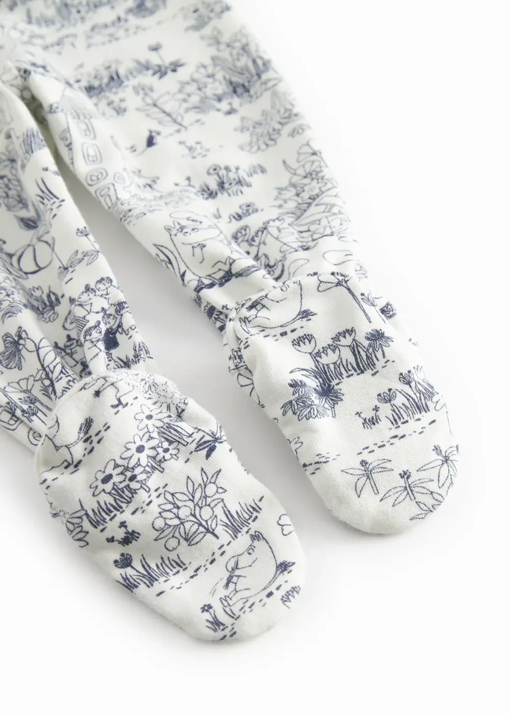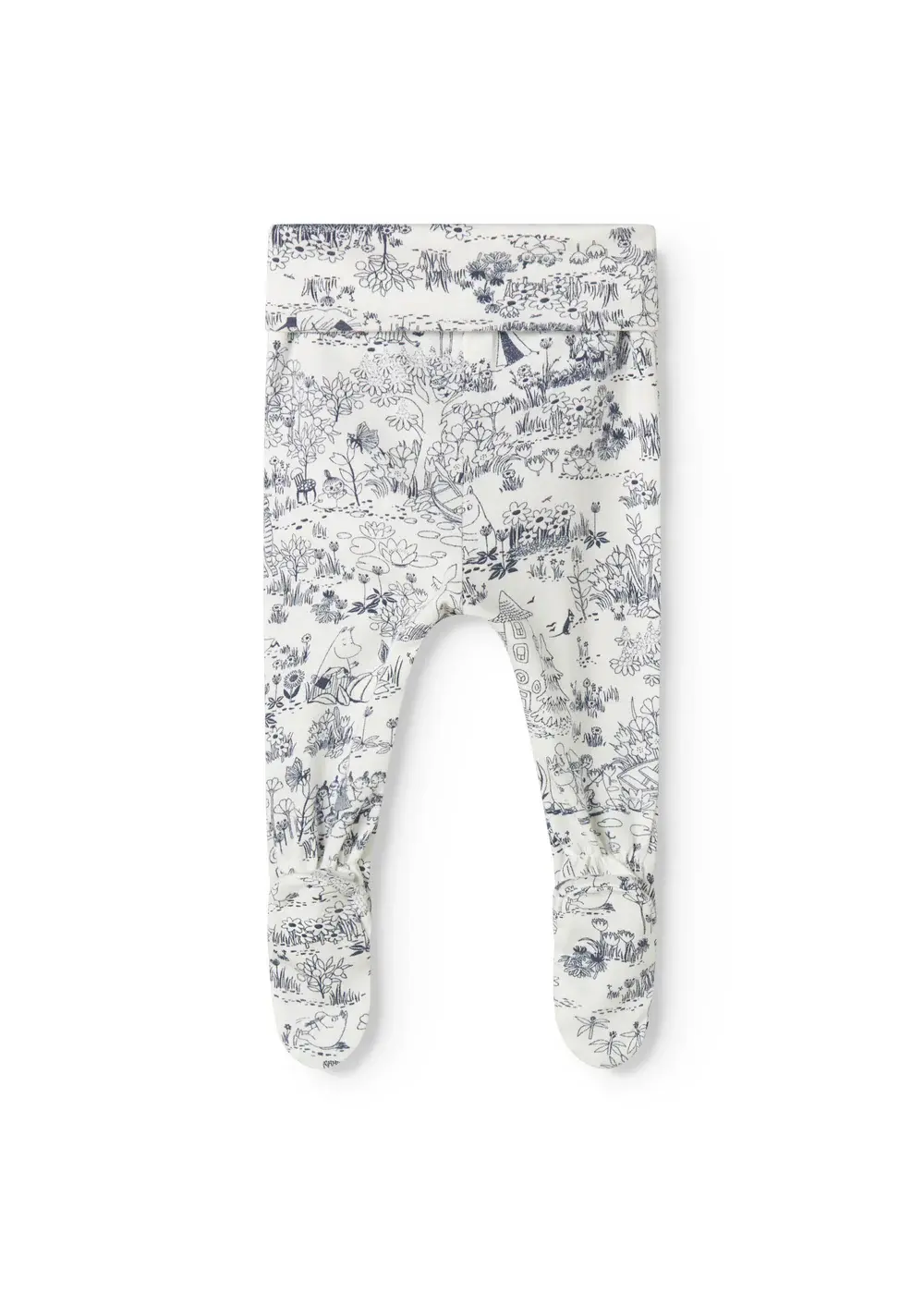 Comfortable pants with feet for newborns with a Moomin print. The pants are soft, stretchy and comfortable to wear.