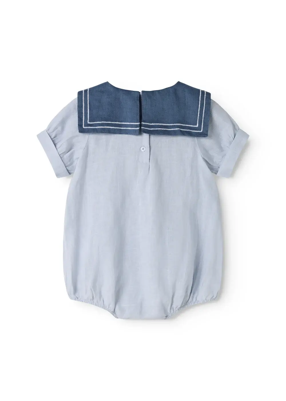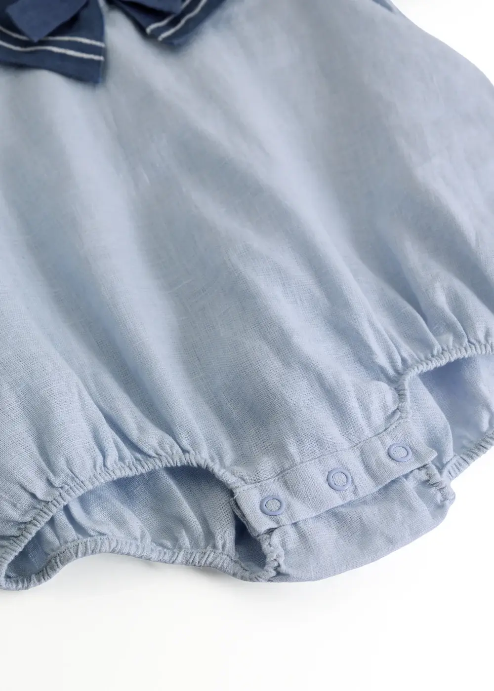 Short-sleeved baby romper with a nice sailor collar and decorative bow at the front. The jumpsuit is made of airy and comfortable linen and has elastic at the hem, as well as snaps between the legs for easy diaper changes.