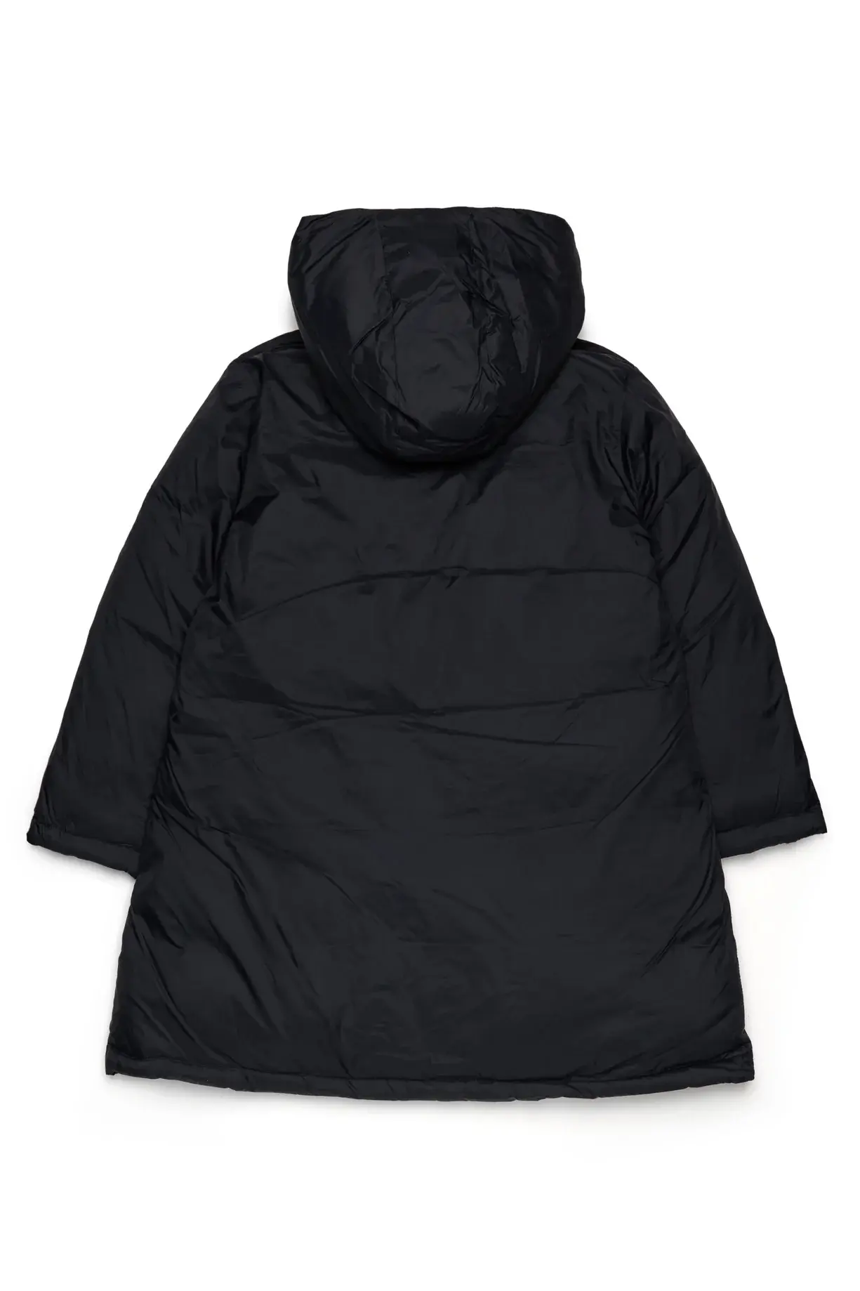 Long hooded padded jacket perfect for winter. Double-pull zip closure allows for modular fit, ensuring comfort and versatility.