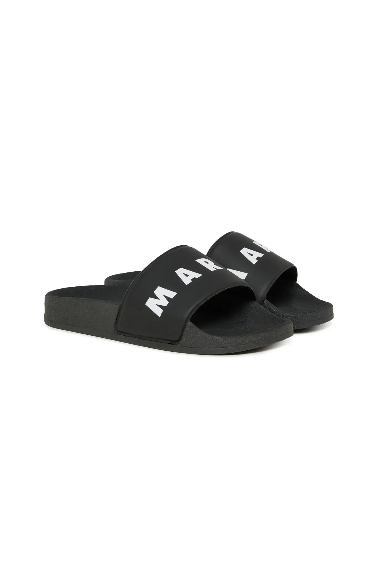 Modern design slide slippers. Institutional logo in contrasting colour on the upper. PVC upper. Polyurethane sole. Made in Italy.