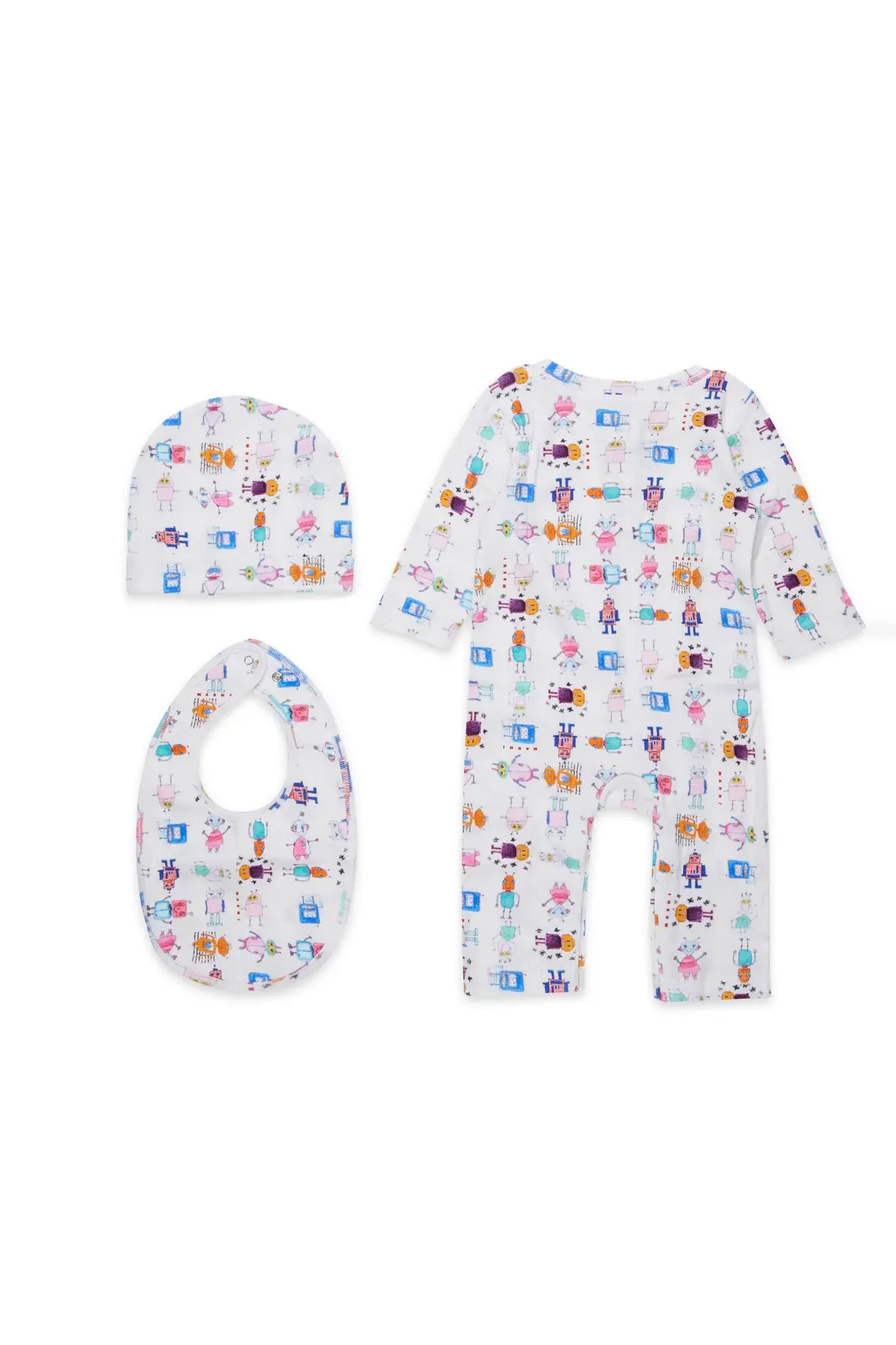 Soft microcostine knit birth set with matching bodysuit, cap and bib with allover Galaxy robot-themed graphics. The kit comes inside an original gift-box.