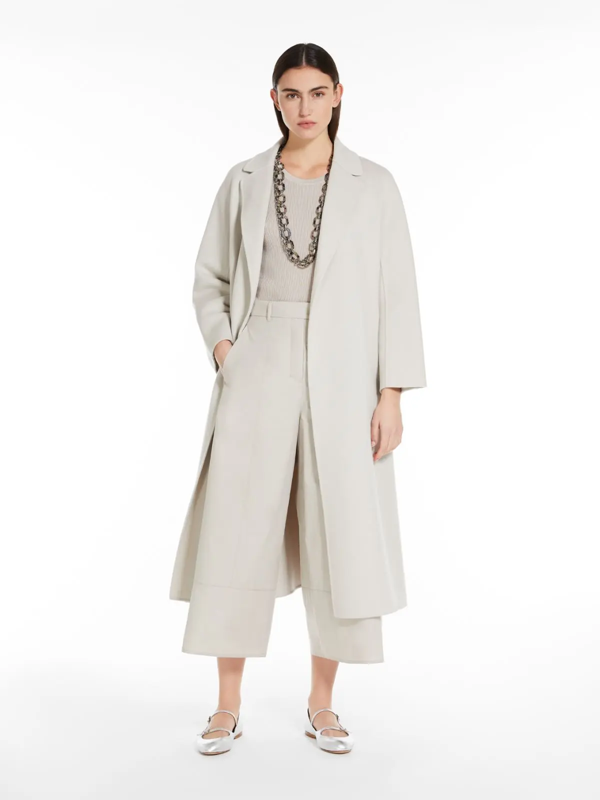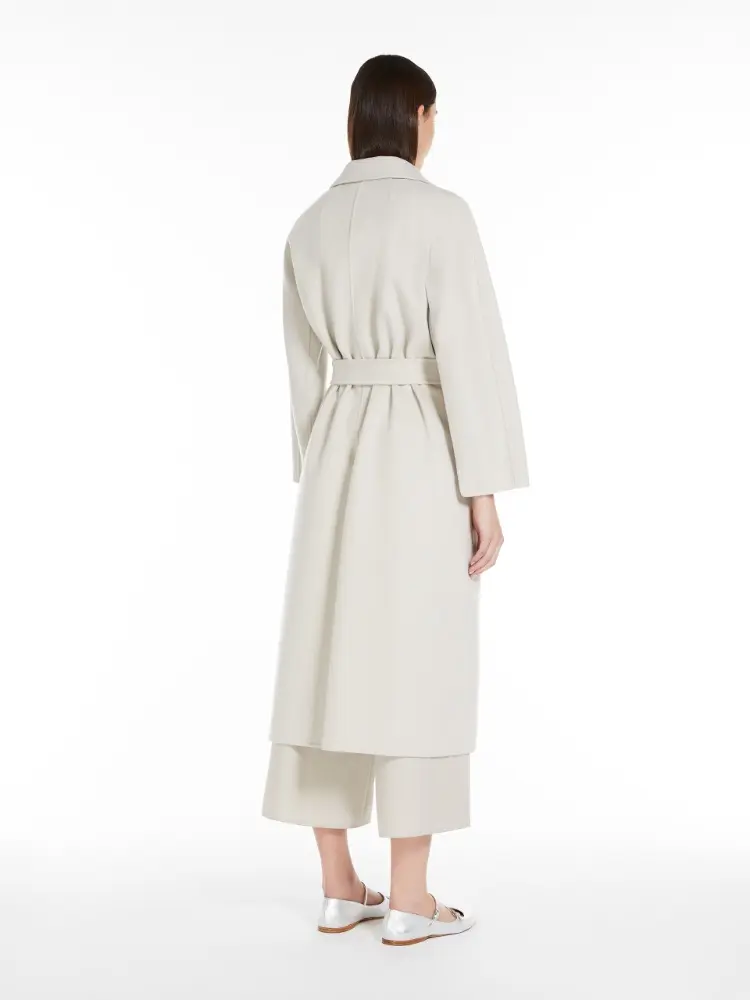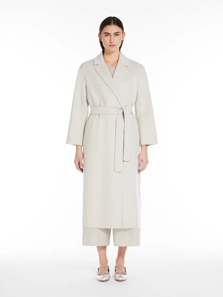 Midi robe coat in a straight fit, slightly flared at the hem, crafted from fine hand-sewn double-faced pure wool fabric. The unlined design boasts a lapel collar, side seam pockets and kimono sleeves. The matching belt highlights the figure.