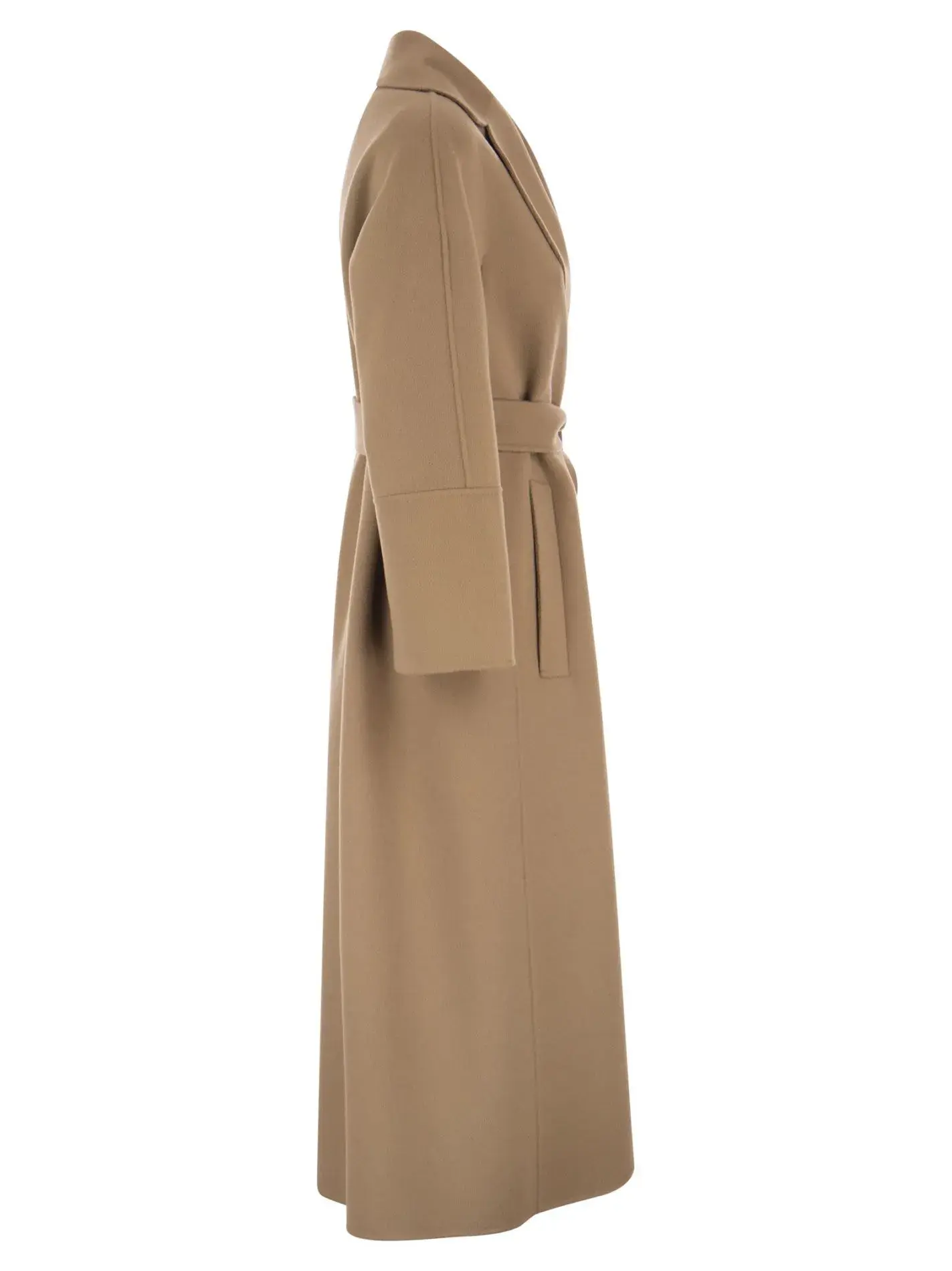 Long coat in hand-sewn pure wool double fabric, with lapel collar and welt pockets. Slightly flared line at the bottom. Fastened with matching belt.