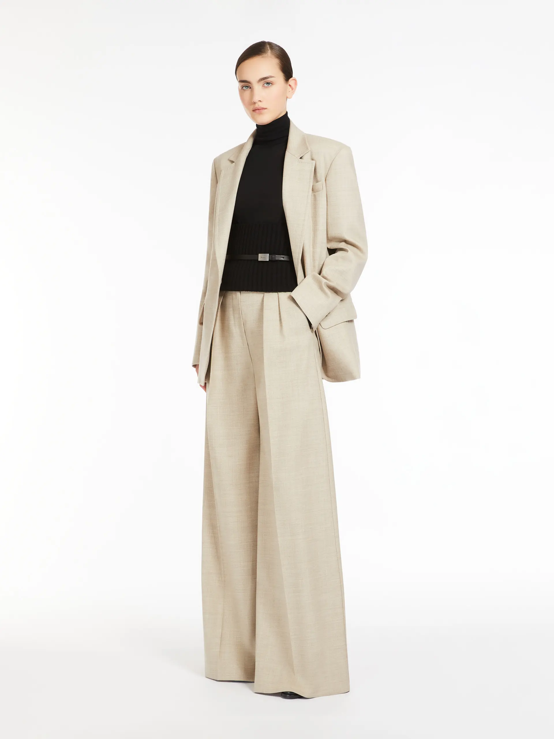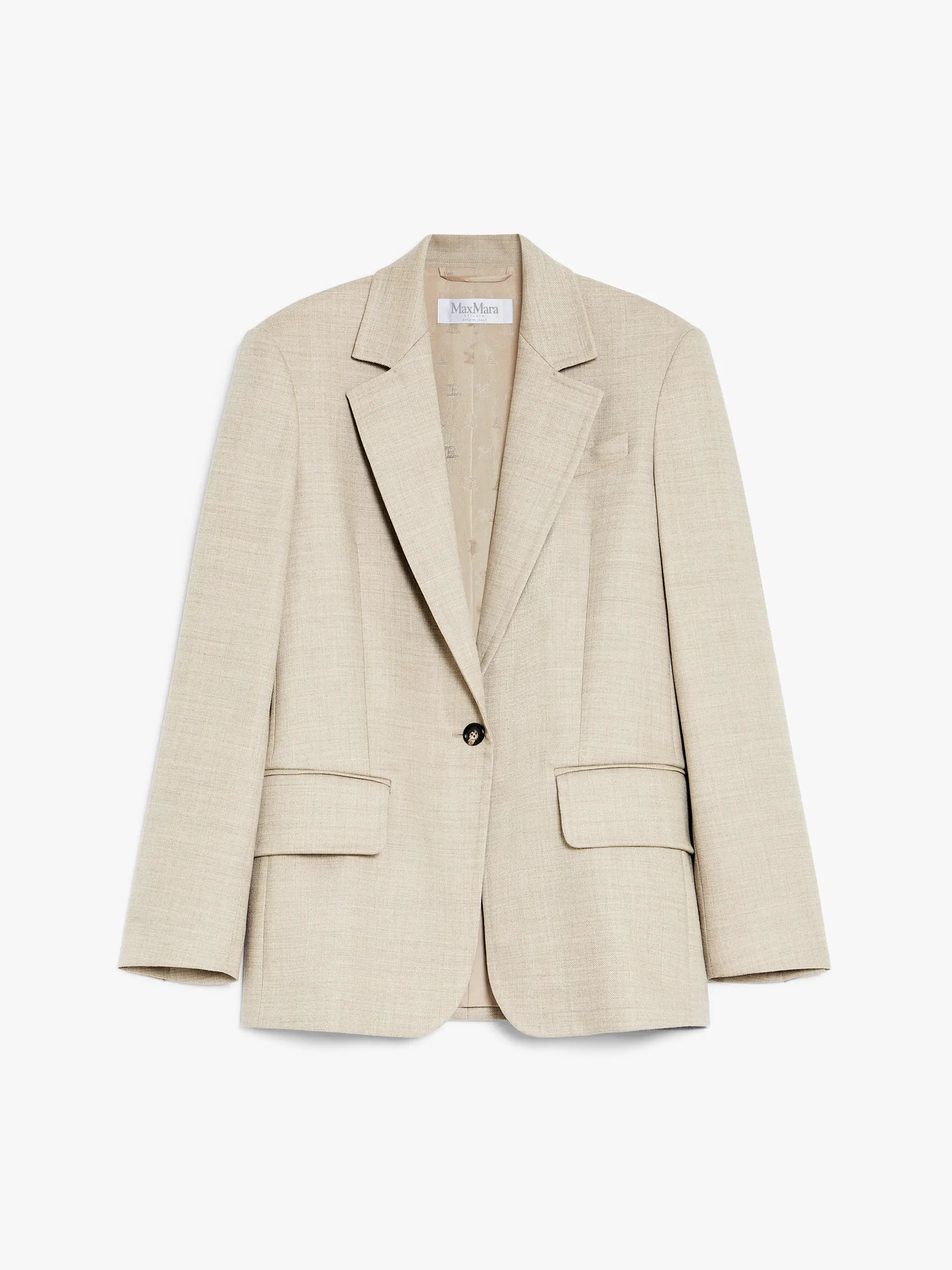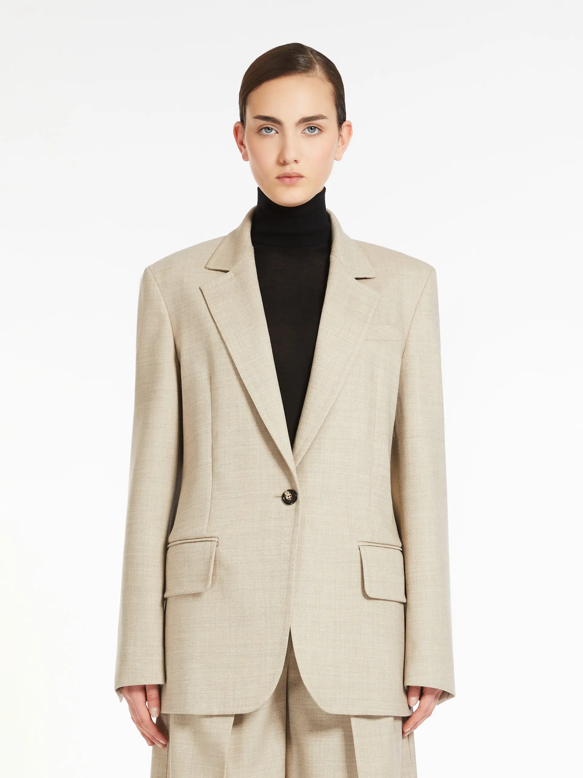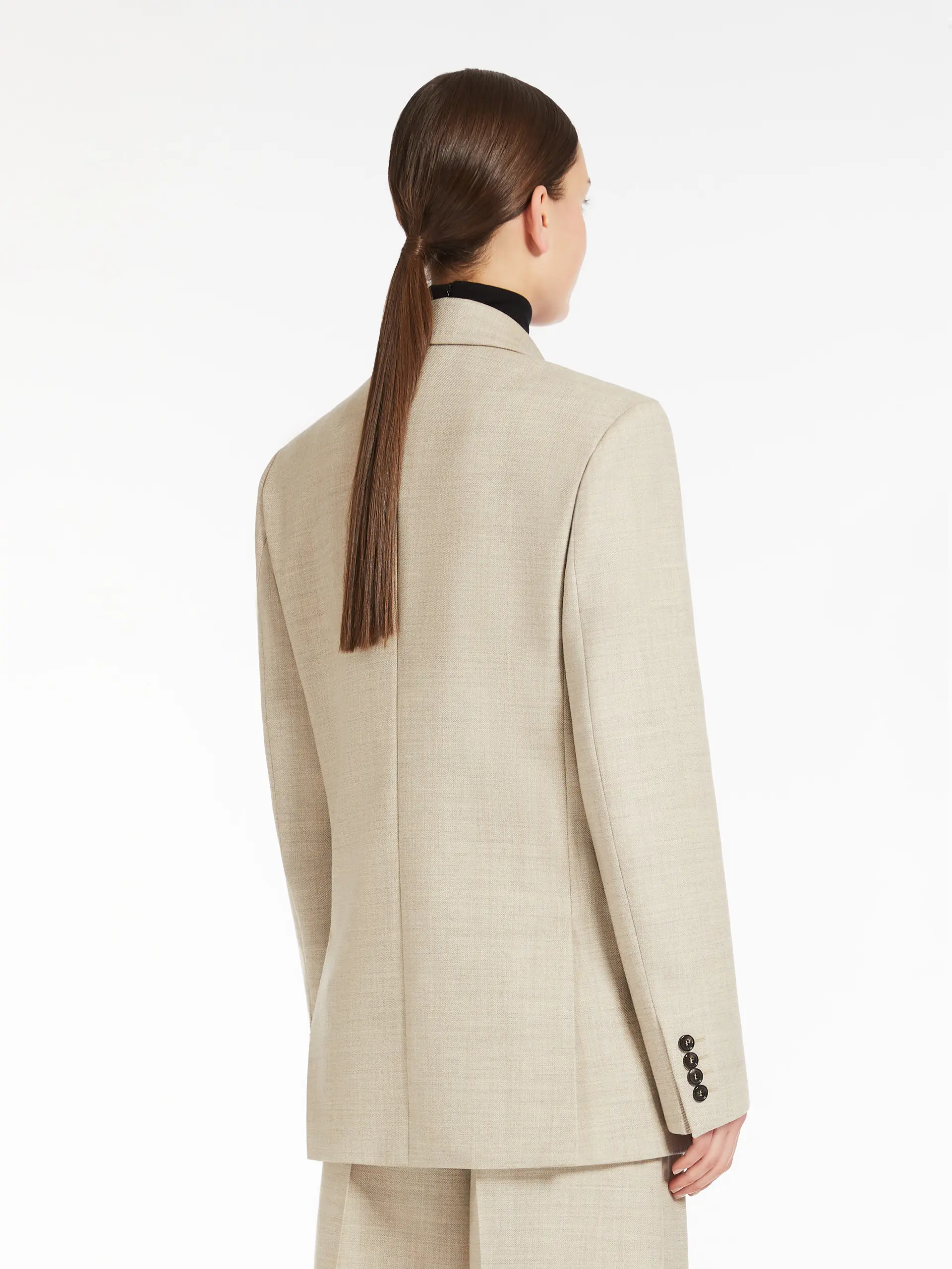 Straight double-breasted blazer made of heavy, pure wool mélange gabardine. Lined garment with lapels, breast pocket and welt pockets with flap on the front. Finished with lateral vents on the back and long set-in sleeves with buttons on the cuffs. Fastened with one mother-of-pearl button on the front.
