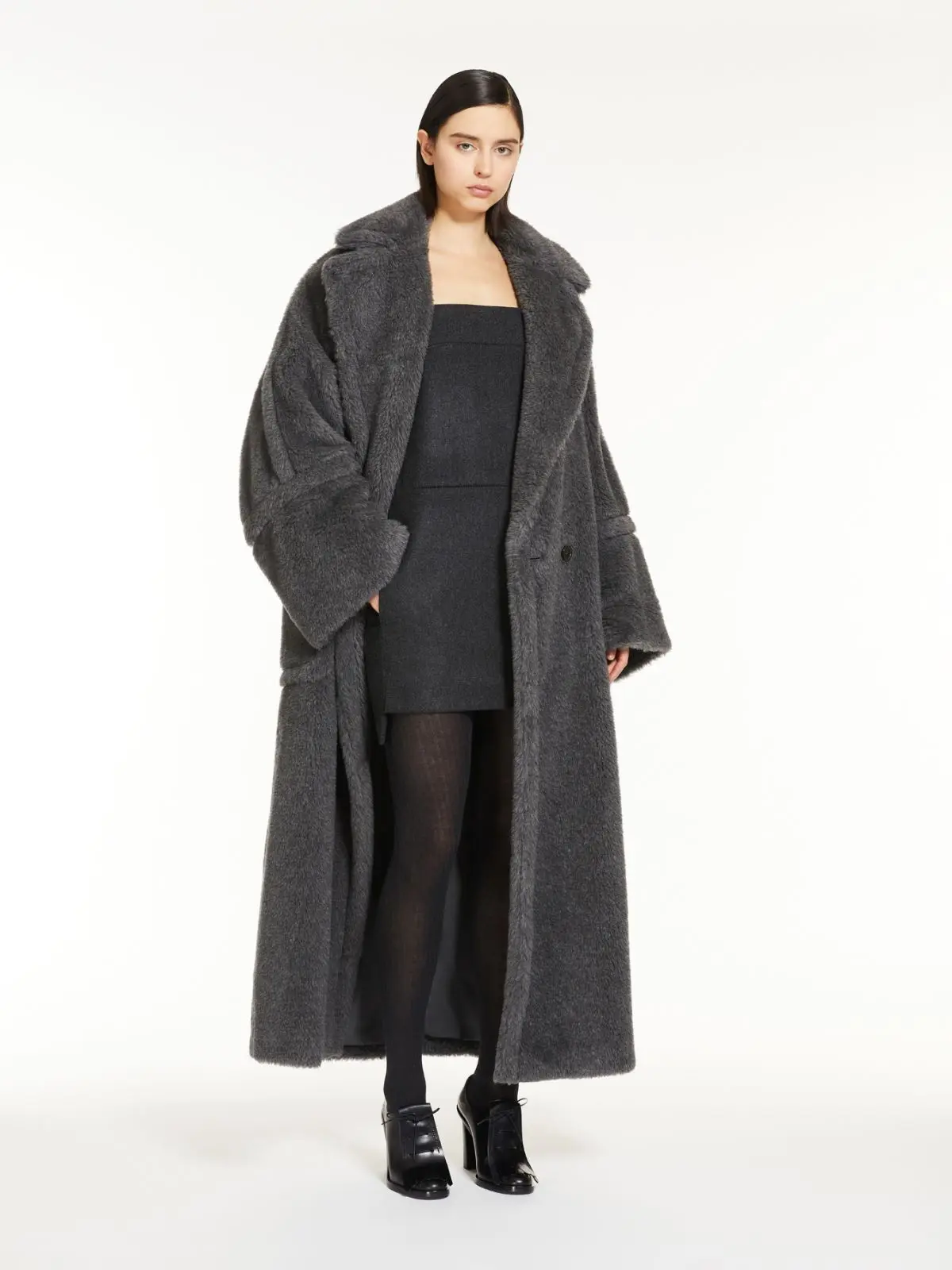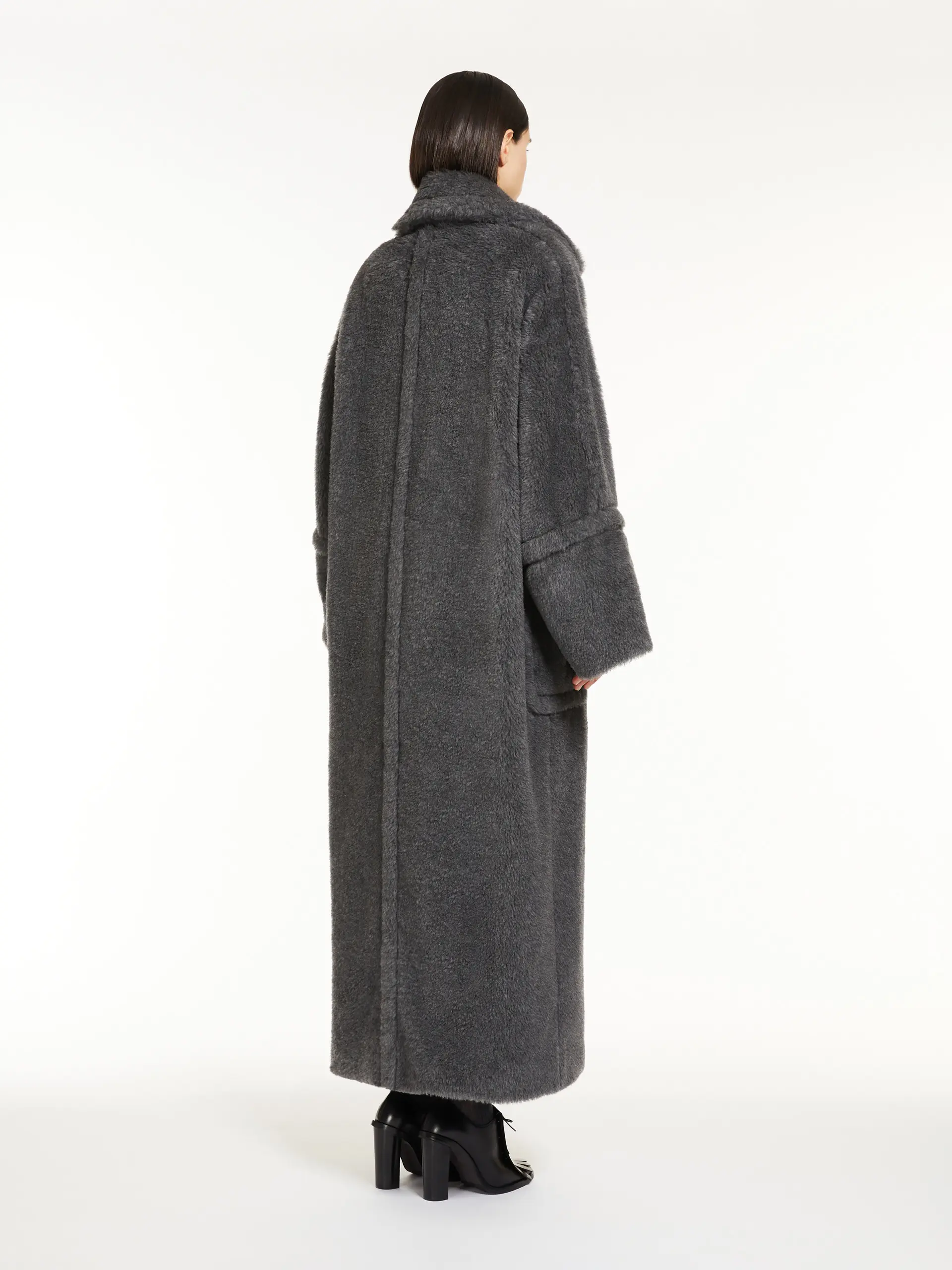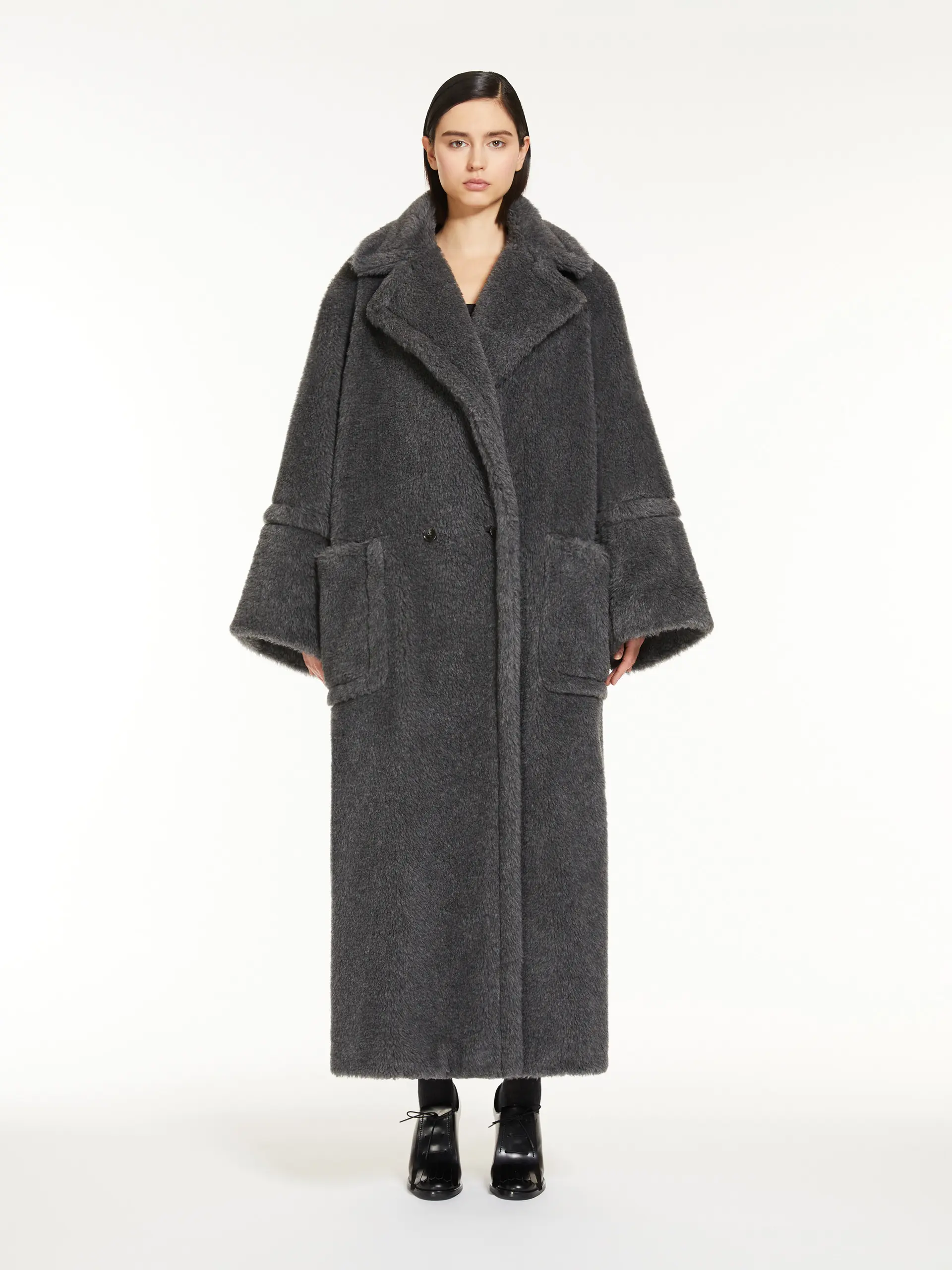 Long, double-breasted coat made of iconic wool and alpaca Teddy fabric on a silk base. The oversized enveloping silhouette features wide kimono sleeves with raised stitching at the cuff, a lapel collar and patch pockets on the front. The lined style closes with two visible buttons.