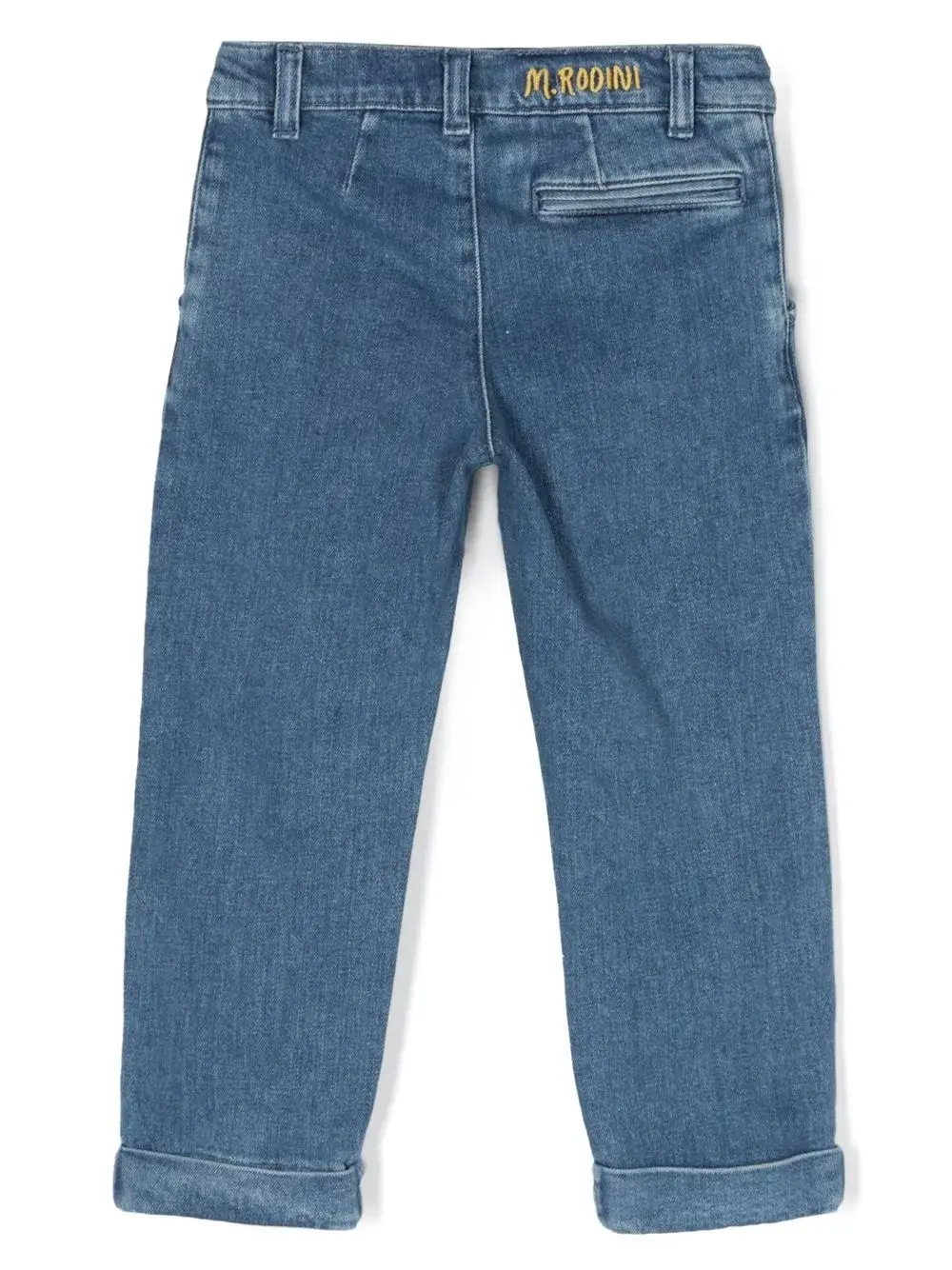 indigo blue stretch organic cotton denim concealed fly and button fastening belt loops pleat detailing two side slash pockets embroidered logo to the rear rear jetted pocket turn-up cuffs