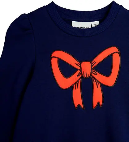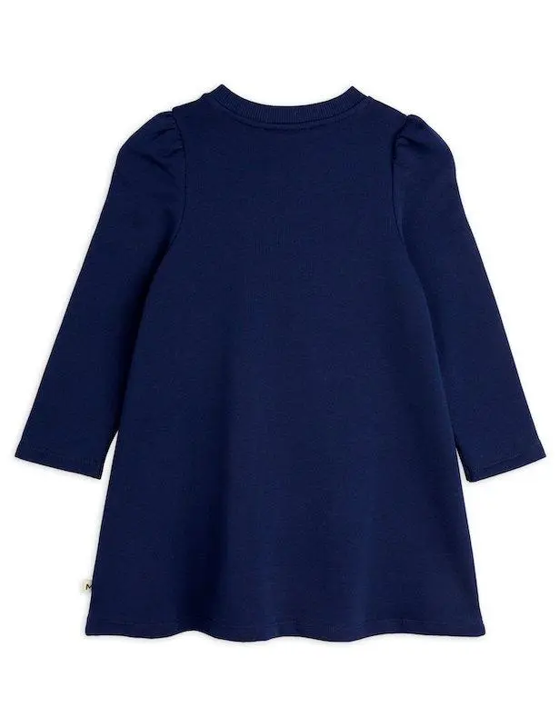 Long sleeve dress in organic cotton jersey, the dress has an A-line shape, puffed shoulders and a bow appliqué.
