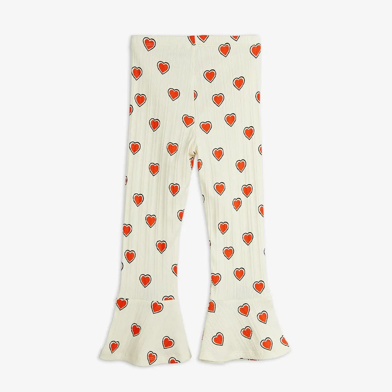 Pants with an outlined heart print, made from GOTS certified organic cotton with a hint of stretch. Designed with a soft elastic waistband and flared legs.