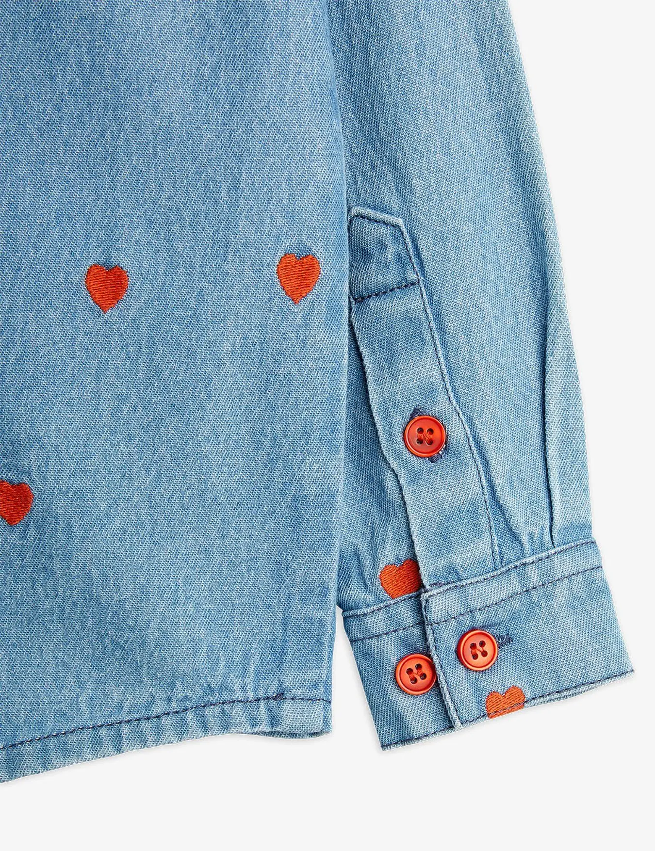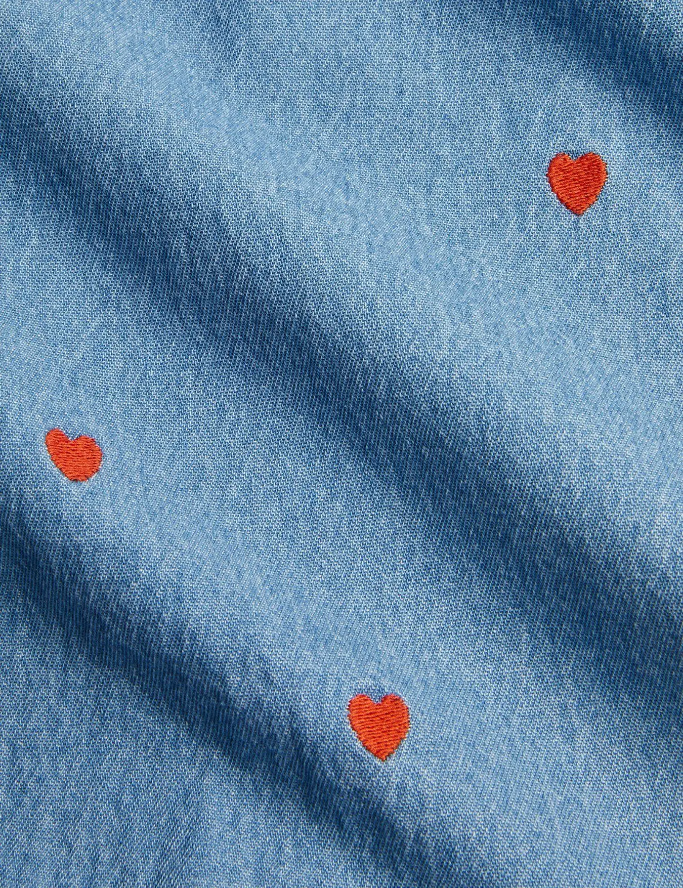 Lightweight denim shirt made from 100% GOTS certified organic cotton, with embroidered red mini hearts, chest pocket and red buttons for extra details.