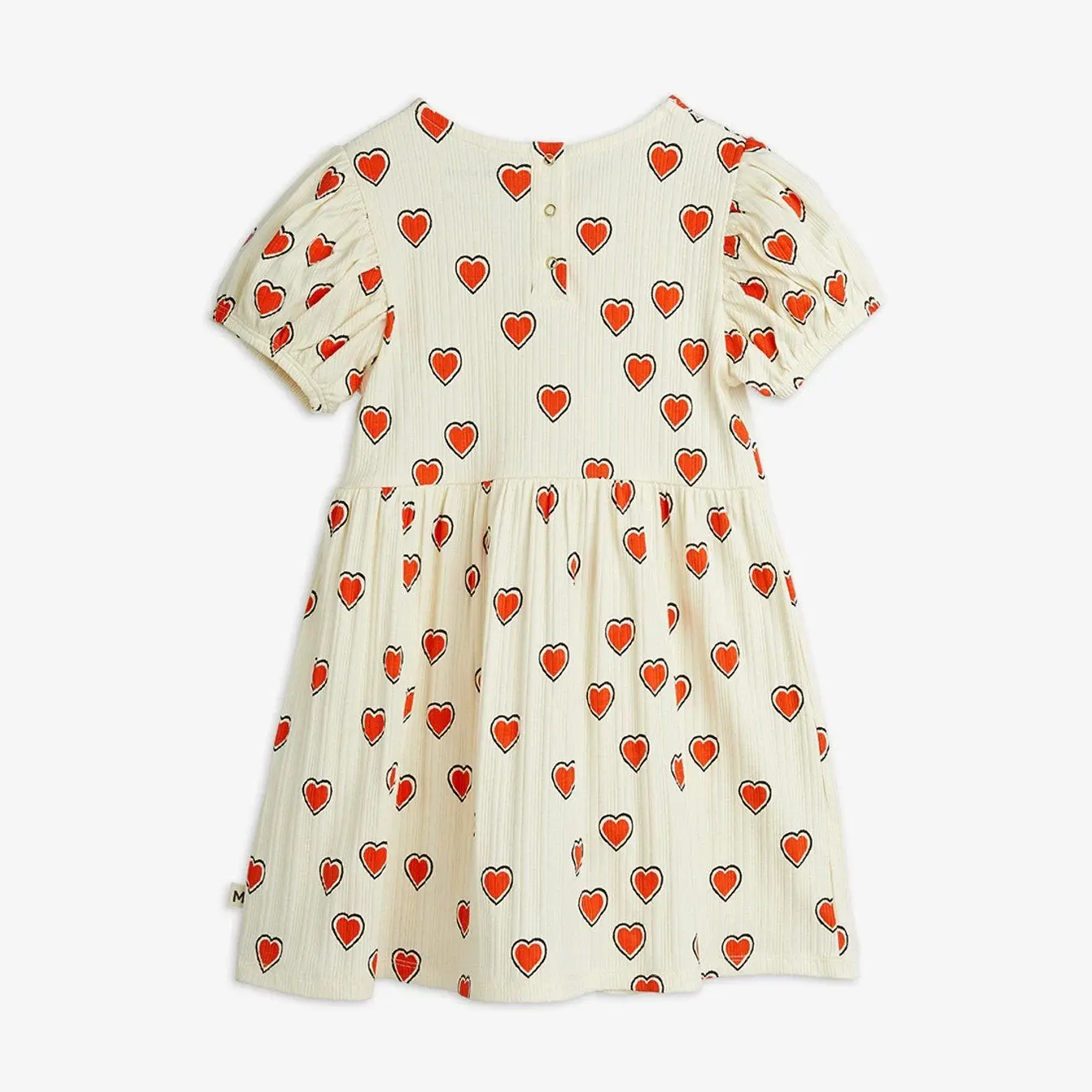 Soft and stretchy short sleeve dress with an all-over heart print, made from 95% organic cotton and 5% elastane for extra comfort and flexibility. Designed with short puff sleeves, a gathered waist and a flared skirt for a playful silhouette. Features a keyhole button closure at the back for easy dressing.