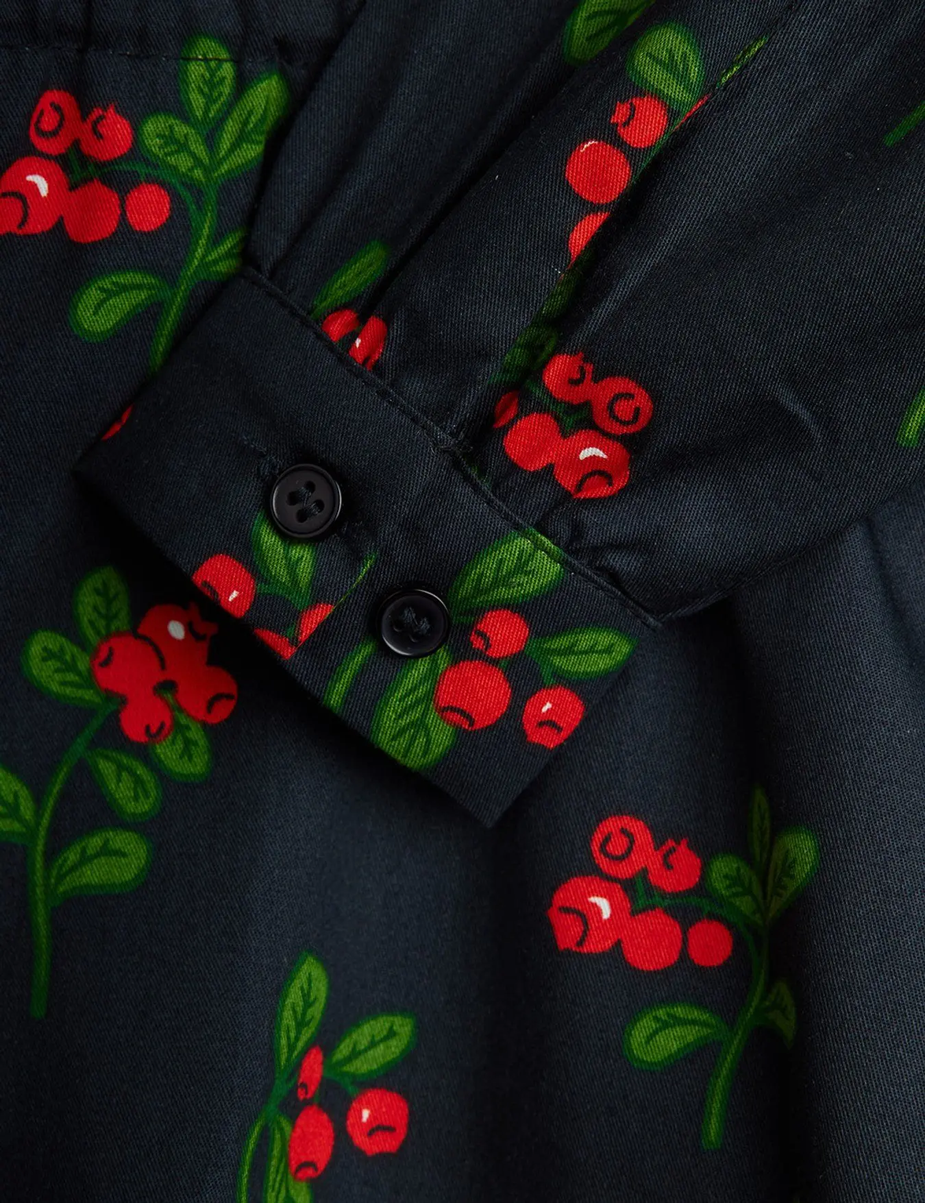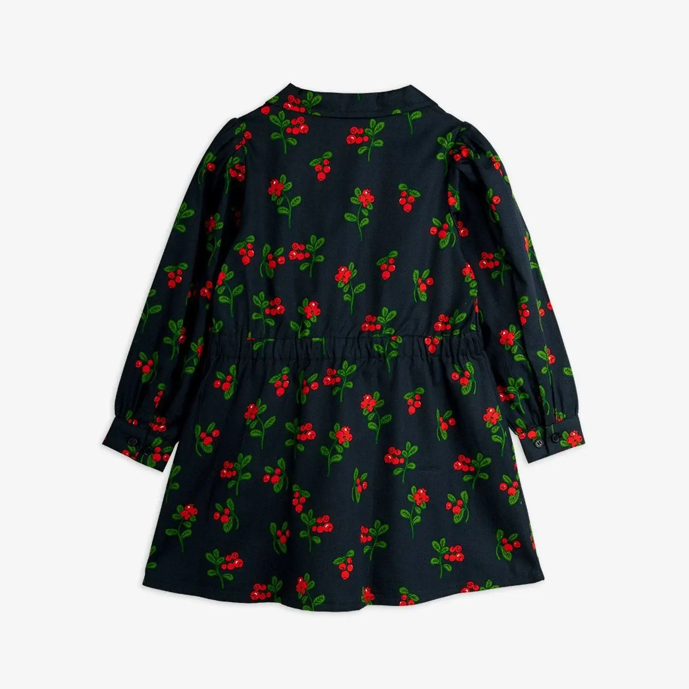 Woven long-sleeved dress in an all-over lingonberry print in 100% GOTS certified organic cotton. Designed with a Cuban collar and buttoning at the front.