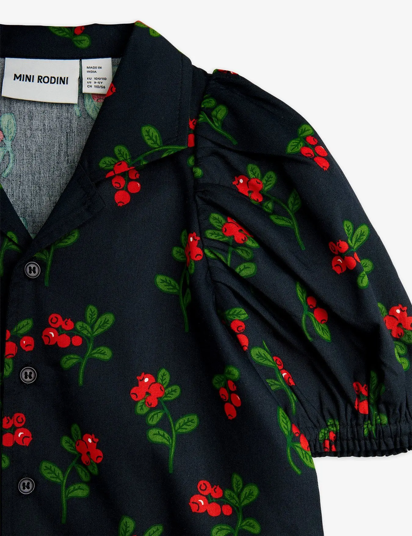 Woven blouse with short puff sleeves in an all-over lingonberry pattern in 100% GOTS certified organic cotton. Designed with a classic button closure at the front.