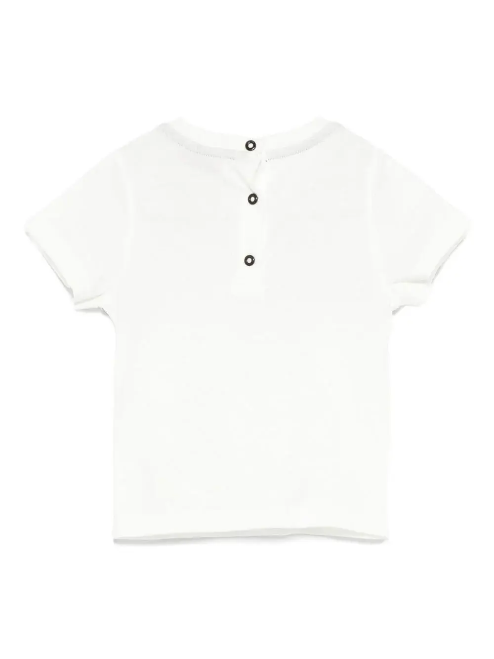 The Missoni Kids white baby boy's T-shirt with chevron pattern is available on the RubinoKids.com online store. Made of 100% cotton. The product is white, has a chevron design, short sleeves, a round neck, and a button closure on the back.