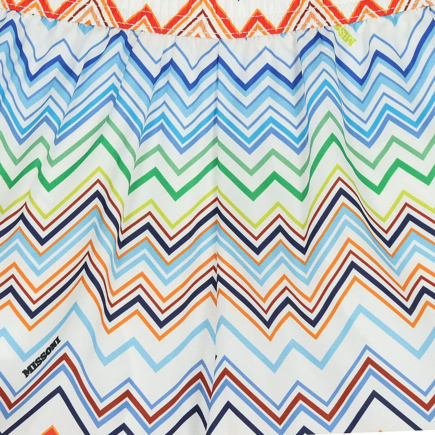 Multi-coloured swim shorts for boys by luxury Italian designer brand Missoni Kids. They are lightweight with the brands iconic zigzag pattern in multi-coloured, a mesh lining and an elasticated drawstring waist. Comes with inner attached mesh brief and logo pouch.