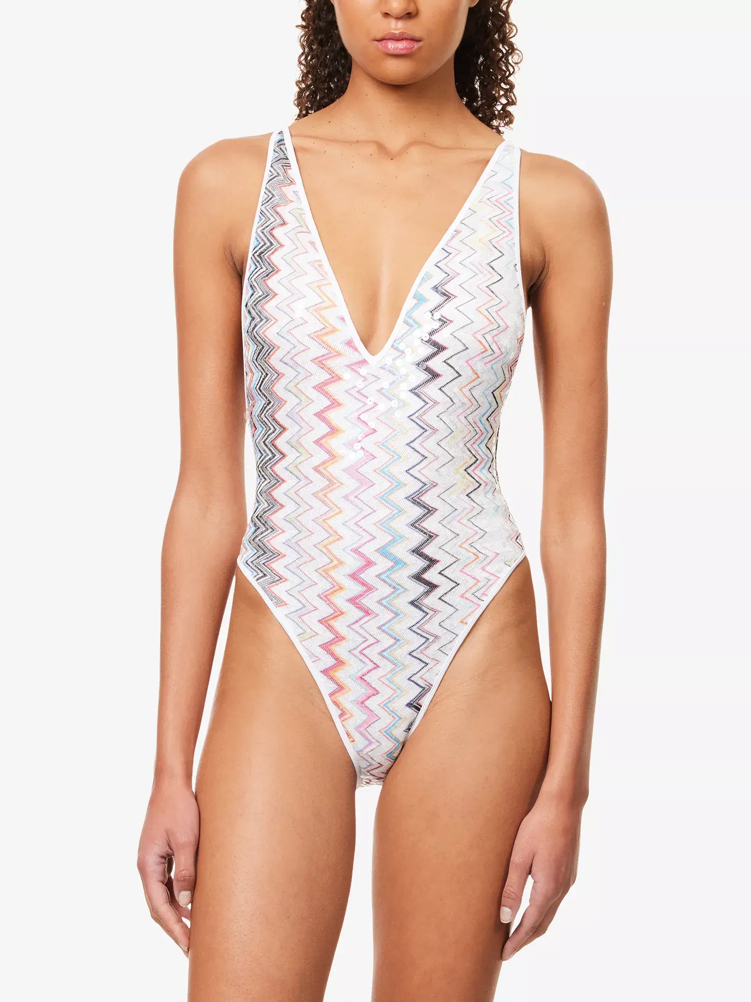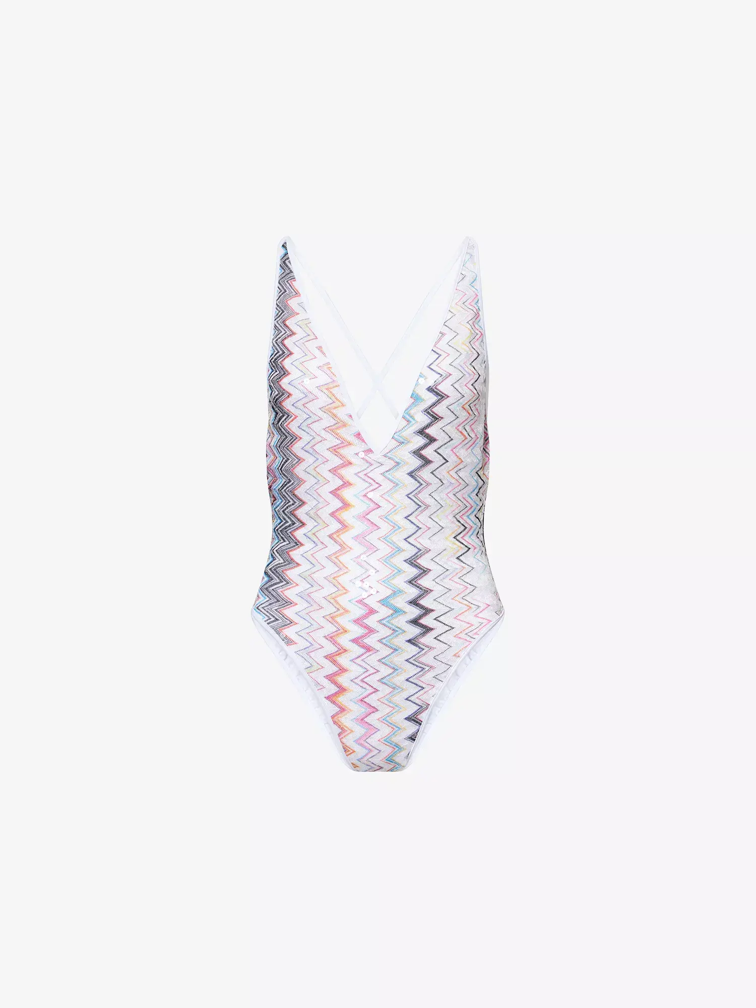 A sophisticated women’s one-piece swimsuit, featuring a V-neckline and Raschel lacework embellished with sequins. The iconic zigzag pattern and open back complete a design that blends class and sensuality.