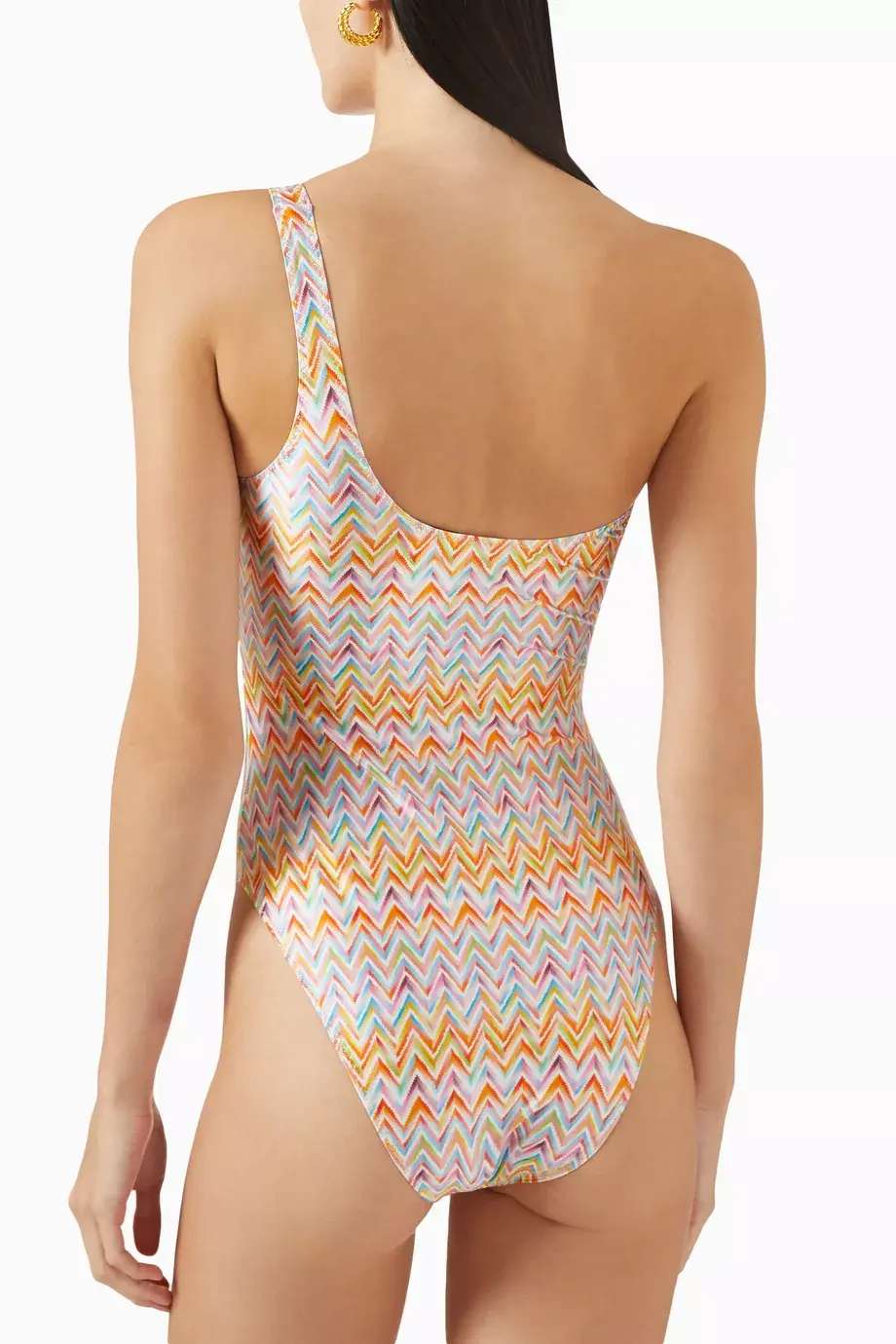 Contemporary design for this one-shoulder one-piece swimsuit, made from printed technical fabric with the iconic zigzag pattern. A perfect choice for a modern, distinctive look that celebrates the female silhouette.
