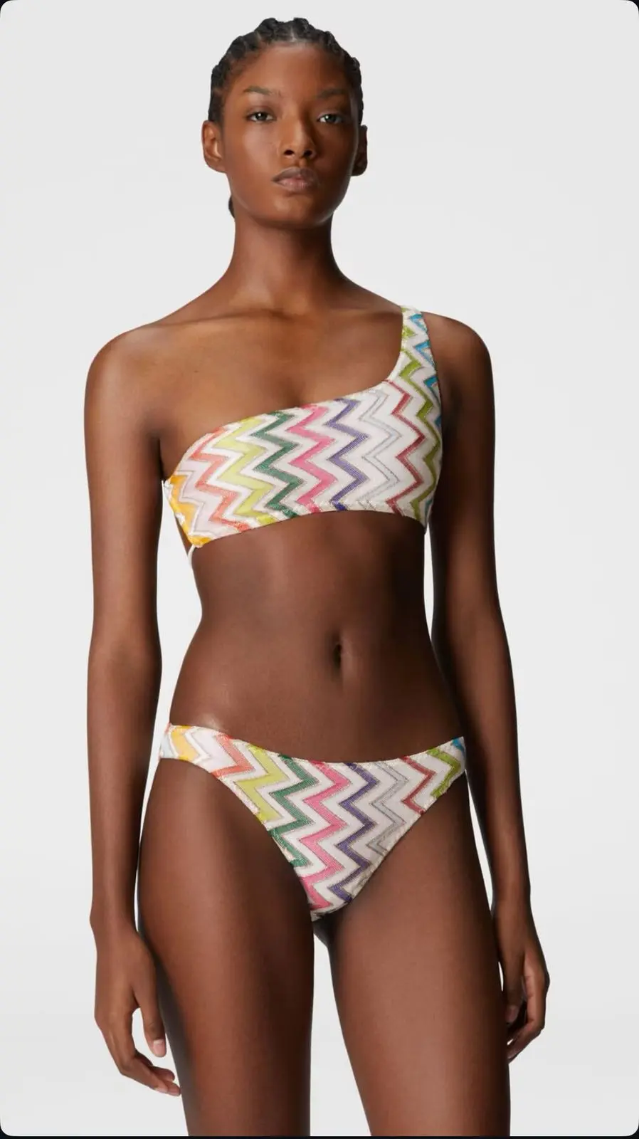 With its one-shoulder silhouette and criss-cross ties at the back, the swimsuit in Raschel and lamé highlights the iconic Missoni zigzag pattern. An ideal piece for refined, dynamic elegance.