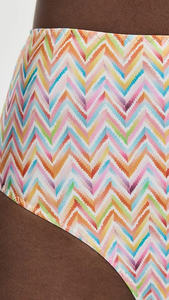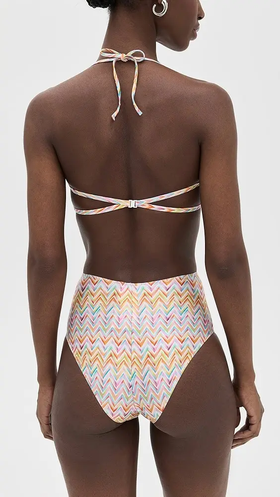 Retro lines and modern details come together in this bikini with high-waisted bottoms and underwire top, featuring a neck tie. Made from printed technical fabric, it celebrates Missoni’s iconic zigzag motif with timeless elegance.