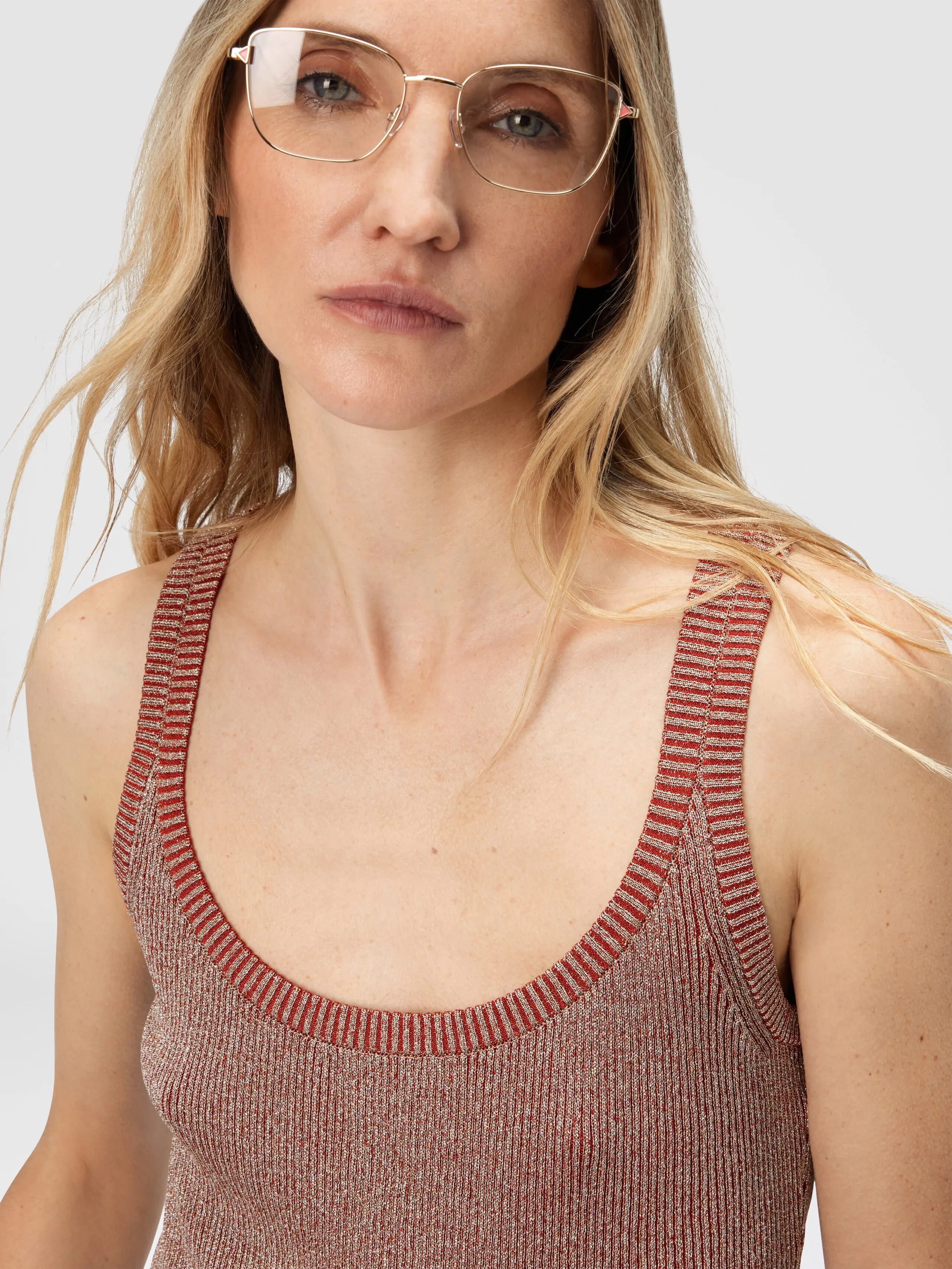 An essential yet refined women’s tank top, made from viscose and lamé blend with fine vanisé workmanship. The round neckline enhances the clean lines of the garment, while the metallic reflections elevate its texture with subtle elegance.