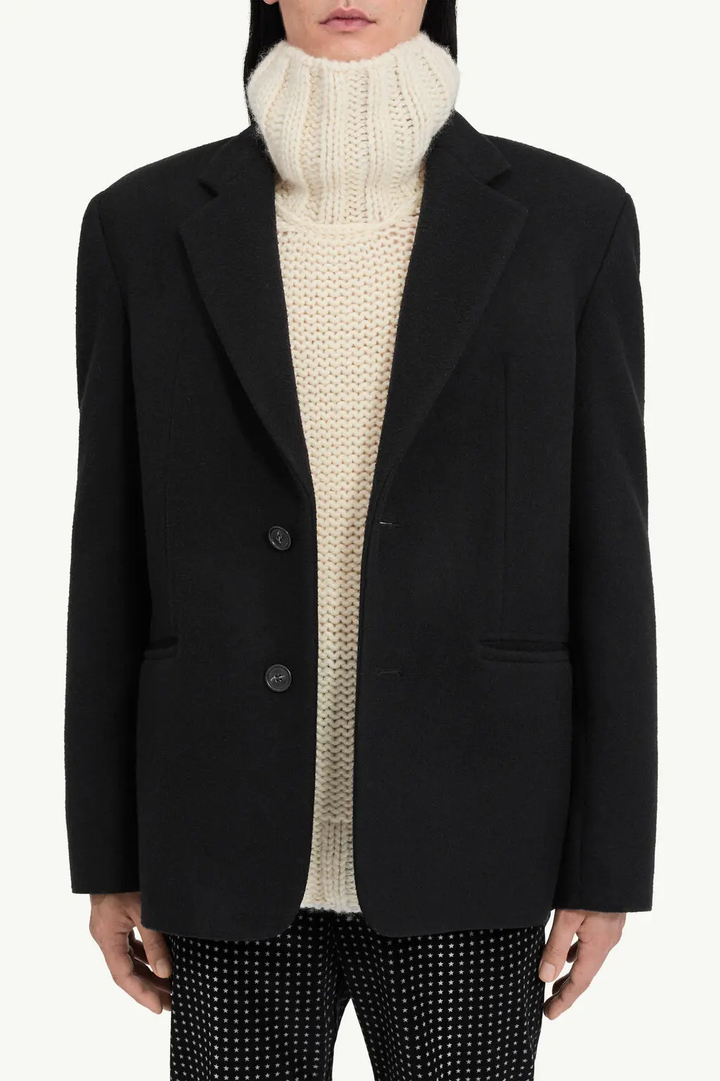 This wool blend blazer distorts tradition with sculptural shoulders and a sharp, abbreviated cut. Contrast elbow patches in smooth coated fabric recall archival patchwork and reimagined function. At the back, a horizontal white stitch line marks MM6’s signature.