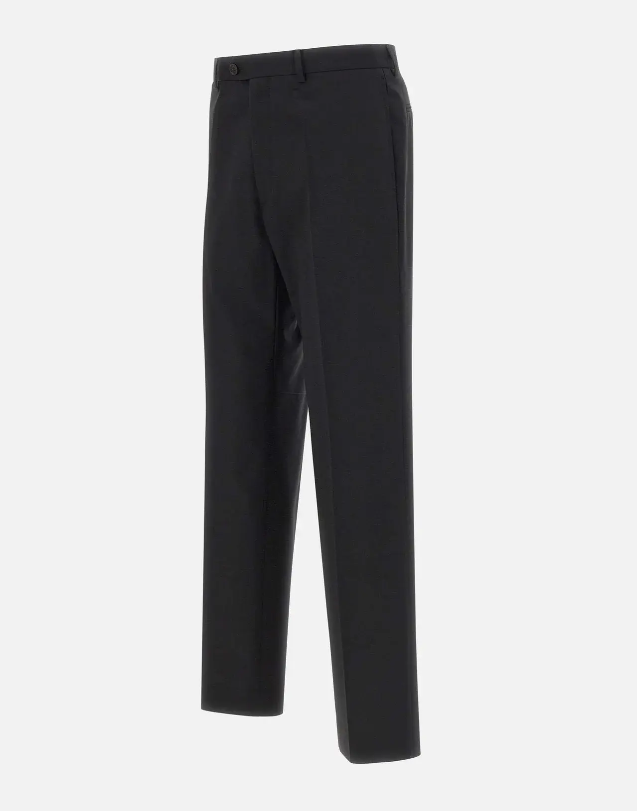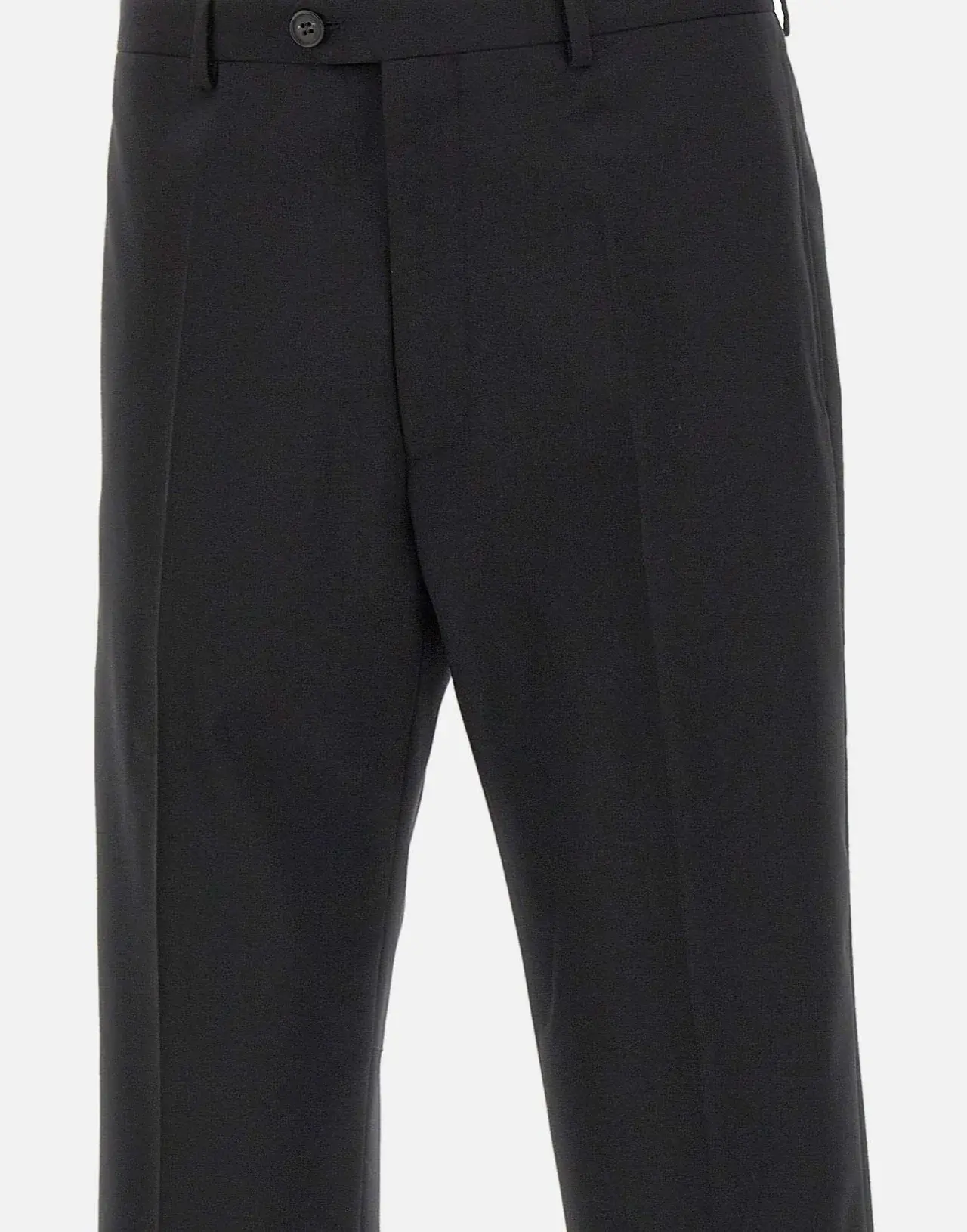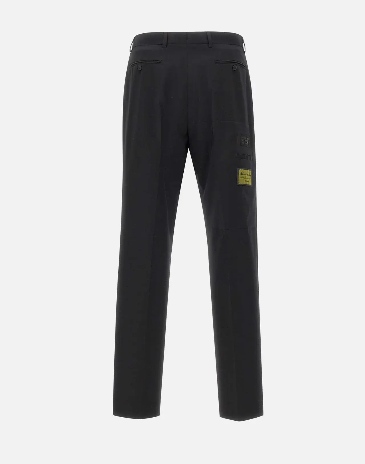 In these tailored wool-blend trousers, a structured silhouette contrasts with a patch at the leg, where jacquard labels – normally hidden inside garments—are exposed and recontextualised. This deliberate act of revealing construction details transforms function into design. At the back, the white stitch line asserts its signature.