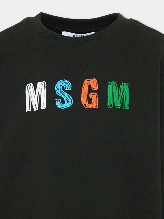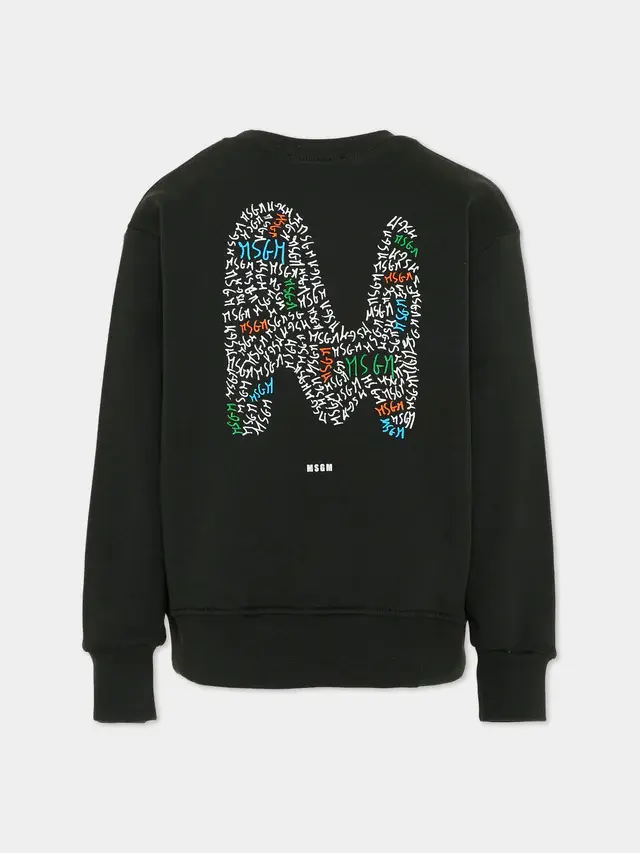 MSGM Kids cotton fleece sweatshirt in a deep black tone with a crew neck and long sleeves. The front features the multicolored MSGM logo with contrasting letters for a graphic effect. The back showcases a large initial M made up of micro-logo writings, completed by a small brand signature in the center. Cuffs, collar, and hem with ribbed finishes maintain the clean and slightly soft line of the model.