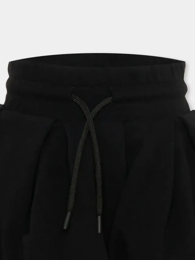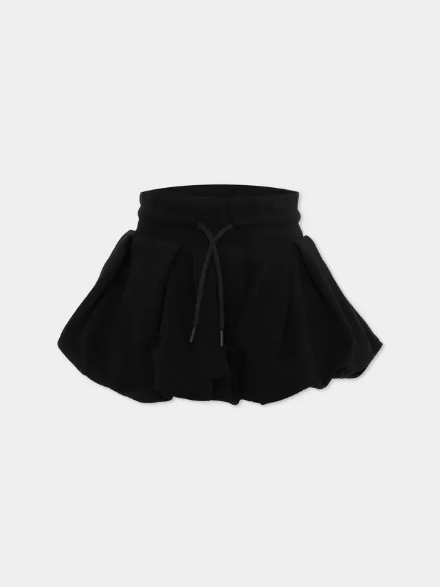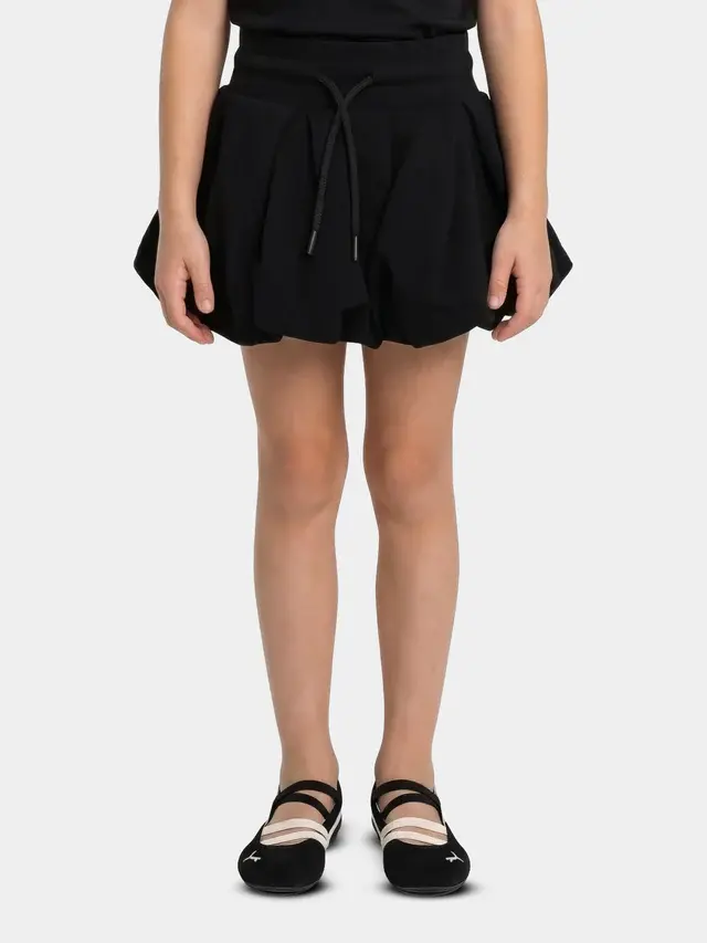 Black casual skirt in cotton fleece from MSGM Kids with marked balloon volume and soft texture. The elasticized waistband with adjustable drawstring ensures daily comfort and a practical fit. The wide structured pleats create a contemporary skater effect, while the small embroidered MSGM logo on the back adds a subtle graphic touch. Integrated shorts complete the model, offering practicality and a compact, structured silhouette.