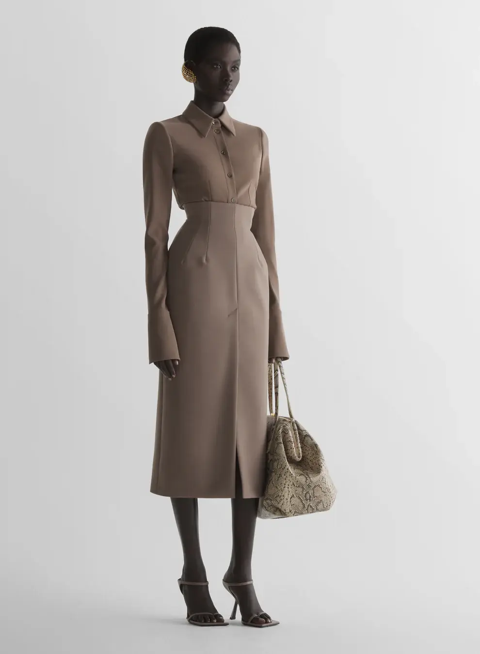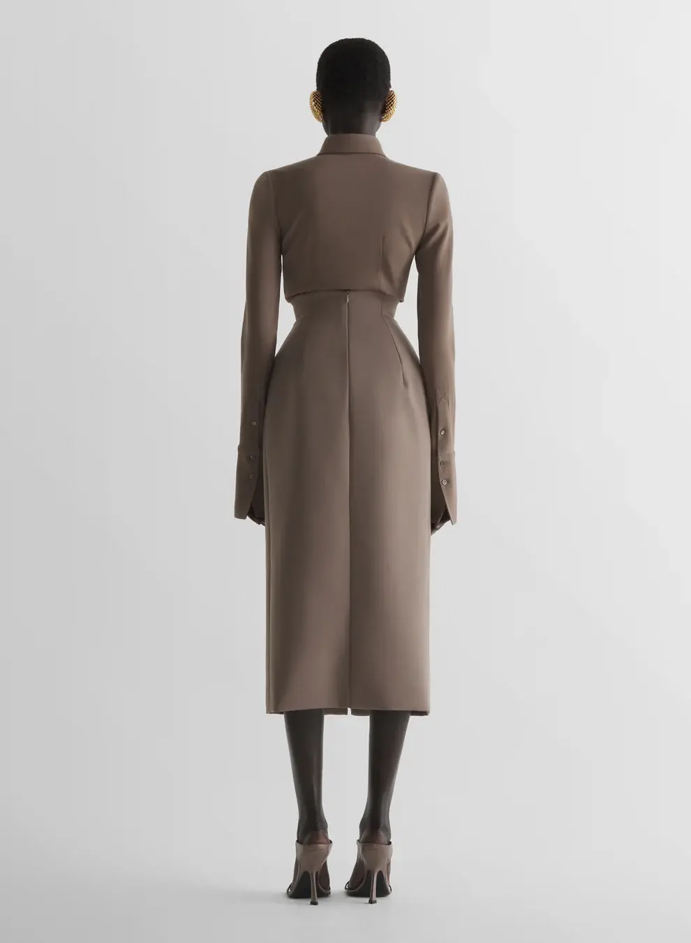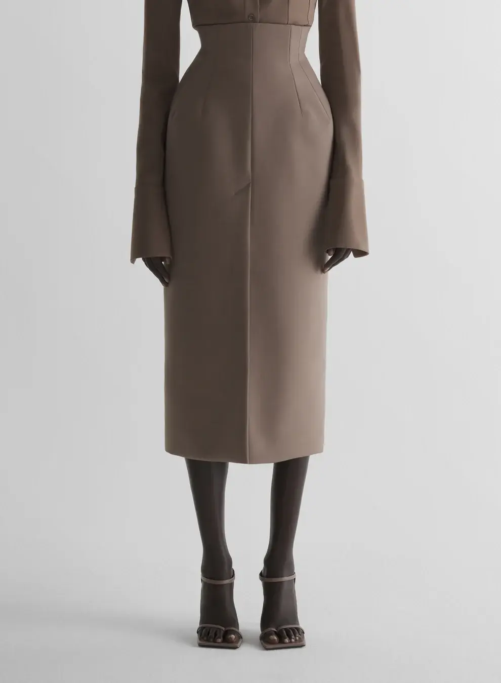 Tailored pencil skirt in stretch tailoring wool High waist with inverted darts Invisible zipper Inside gros-grain belt Long front slit Below-the-knee length Fully lined