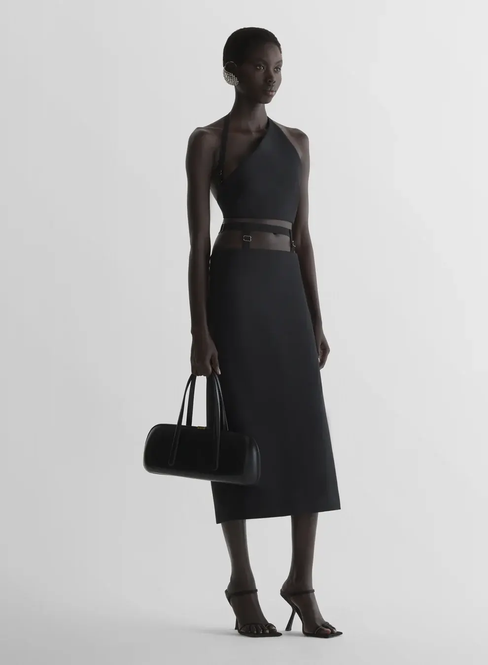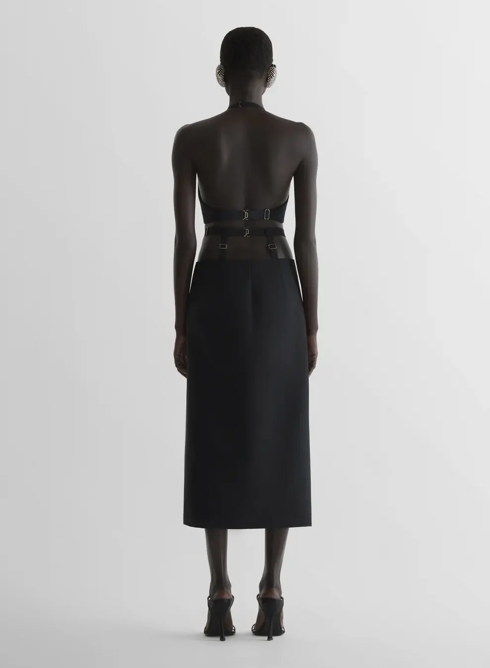 Asymmetric cropped top in stretch tailoring wool Asymmetric halter neck with elastic shoulder strap Open back Elastic garter strap with metal adjuster and hook closure Model is 181 cm / 5'11" and is wearing a size 36