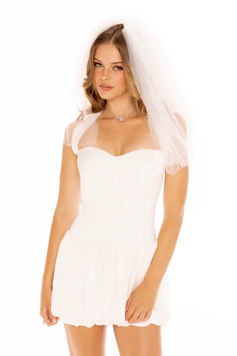 The Wendy Dress blends retro charm with romantic elegance, crafted from soft yellow fabric printed with playful black polka dots. The sculpted strapless bodice features supportive boning, while the sheer tulle halter tie adds a whimsical finish. A pleated bubble skirt completes the look with volume and movement, creating a flirty silhouette that feels both sweet and sophisticated.