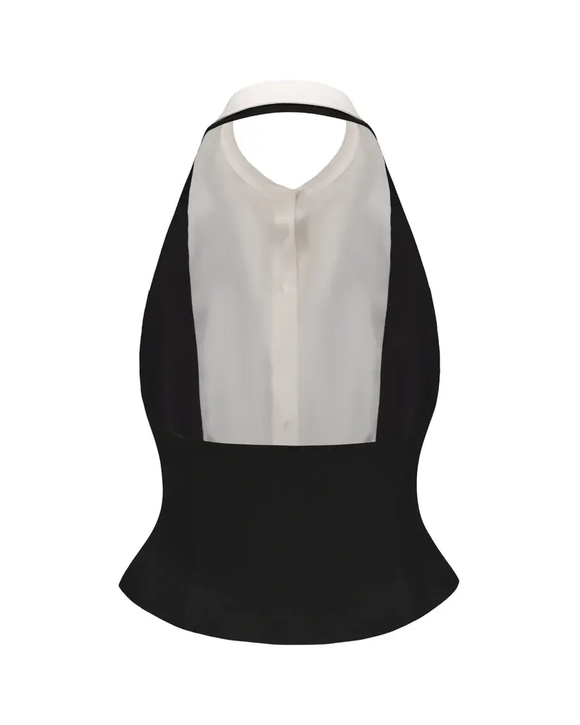 The Anya Vest Top blends structure and sparkle in a refined silhouette. Designed in a black-and-white two-piece illusion, this halter neck vest top features a satin-trimmed collar, sparkling zircon buttons, and a fitted waist with a soft flare at the hem. It’s a modern take on coquette tailoring—polished, playful, and feminine.