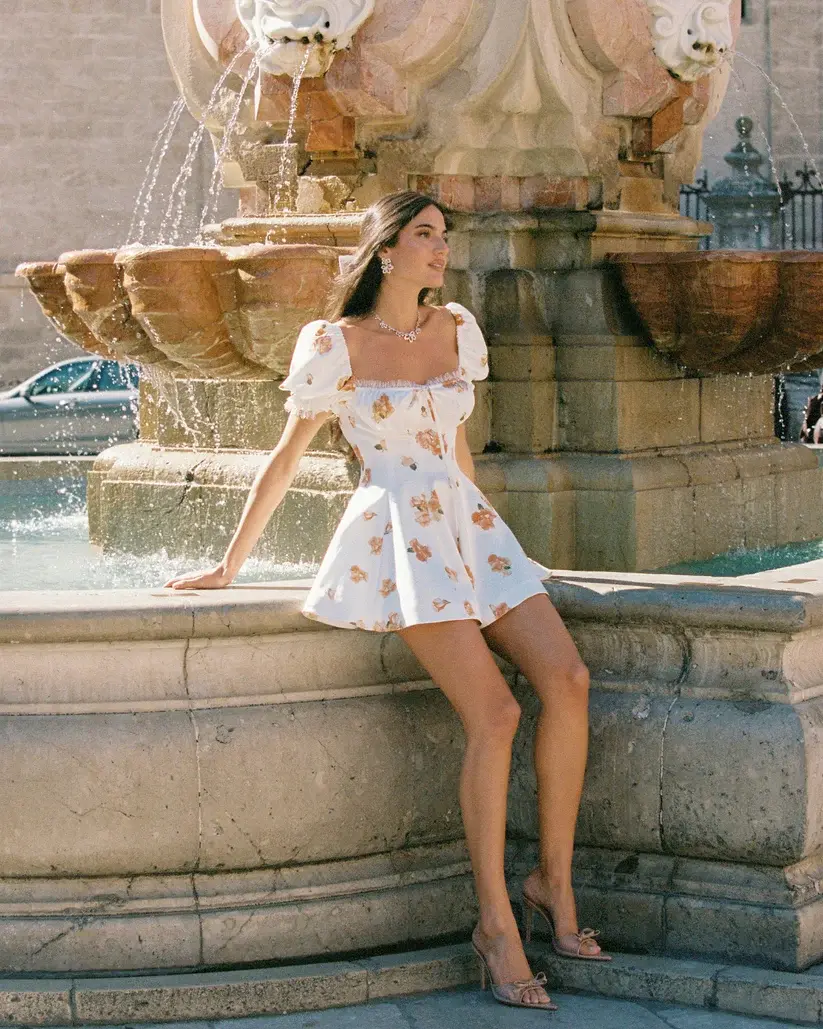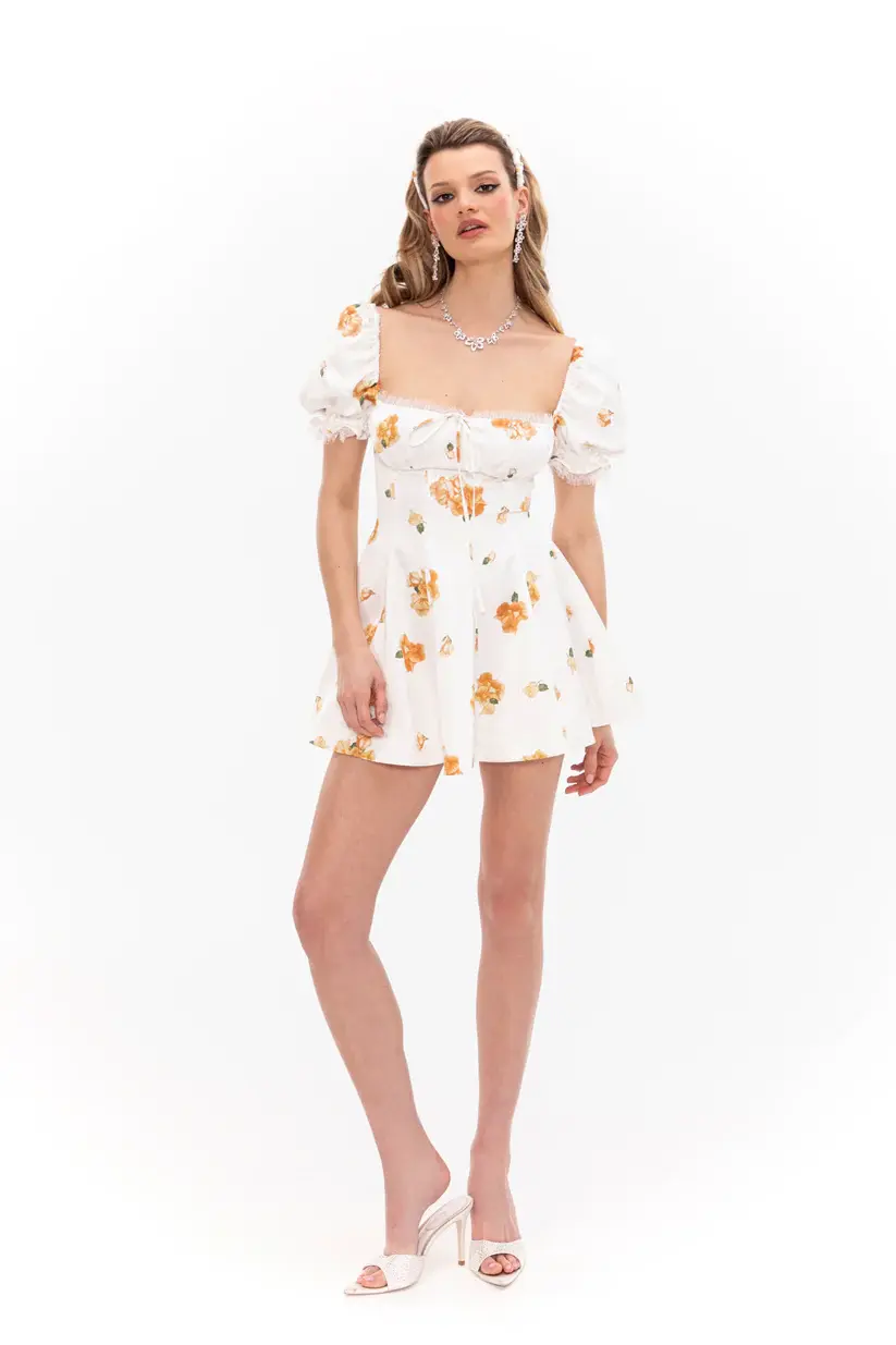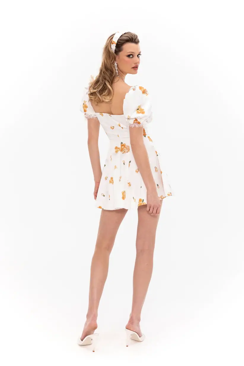 The Theodora Dress has a playful yet sophisticated style and feminine charm. Crafted from smooth white satin, this dress boasts a bold yellow flower print, symbolizing warmth and passion. The puff sleeves, delicate lace at the bust and cuffs, and the ruffled elastic chest design add a touch of romance and elegance. The nipped-in waist and umbrella skirt accentuate your figure, creating a flattering silhouette. Perfect for casual gatherings or summer parties, this dress is a statement of confidence, charm, and elegance.