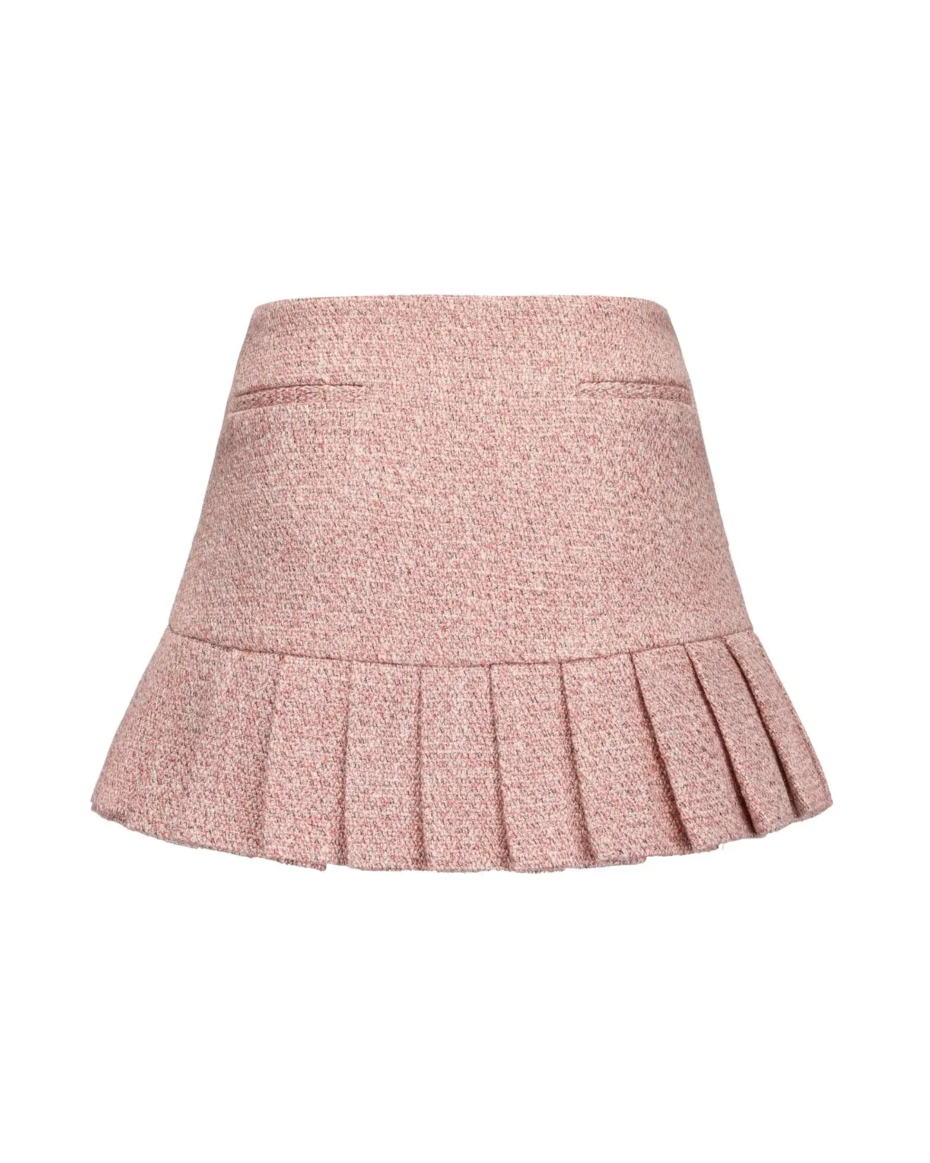 The Gia Pleated Mini Skirt captures the romance of Parisian mornings with its pink tweed skirt design, woven from Chanel-inspired fabric threaded with pink silk, gold, and silver for a luminous sheen. Crisp pleats sway gracefully with each step, while the double satin bow belt skirt detail defines the waist with feminine charm. This pleated mini skirt blends youthful playfulness with timeless couture elegance, making it the perfect luxury skirt for women.