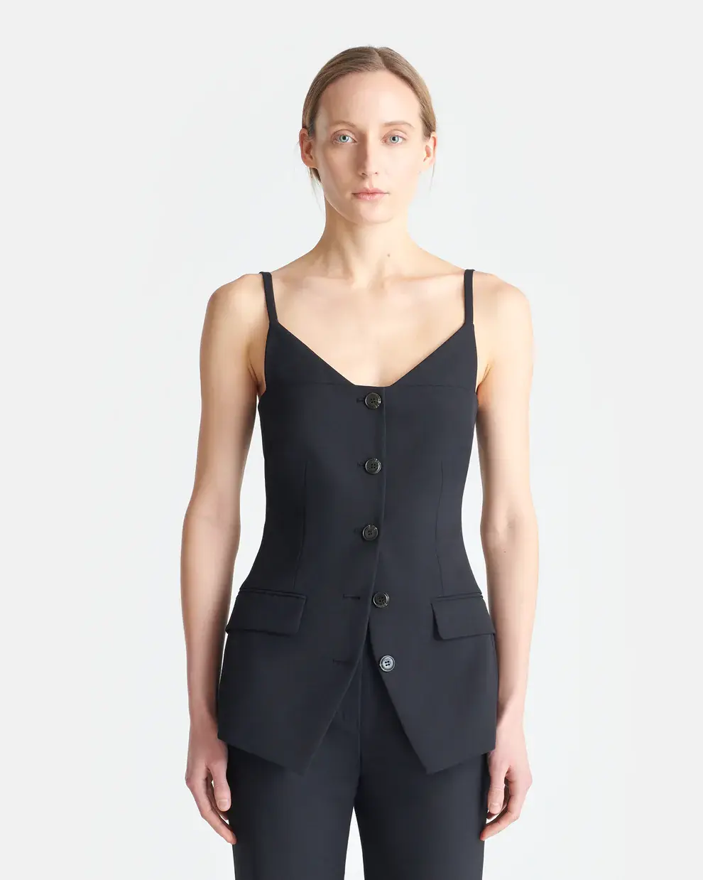 The Cinda top looks deceptively simple from the front – a sharply tailored silhouette with button fastenings and flap pockets at the waist – but turns to reveal an open back for something uniquely Nanushka