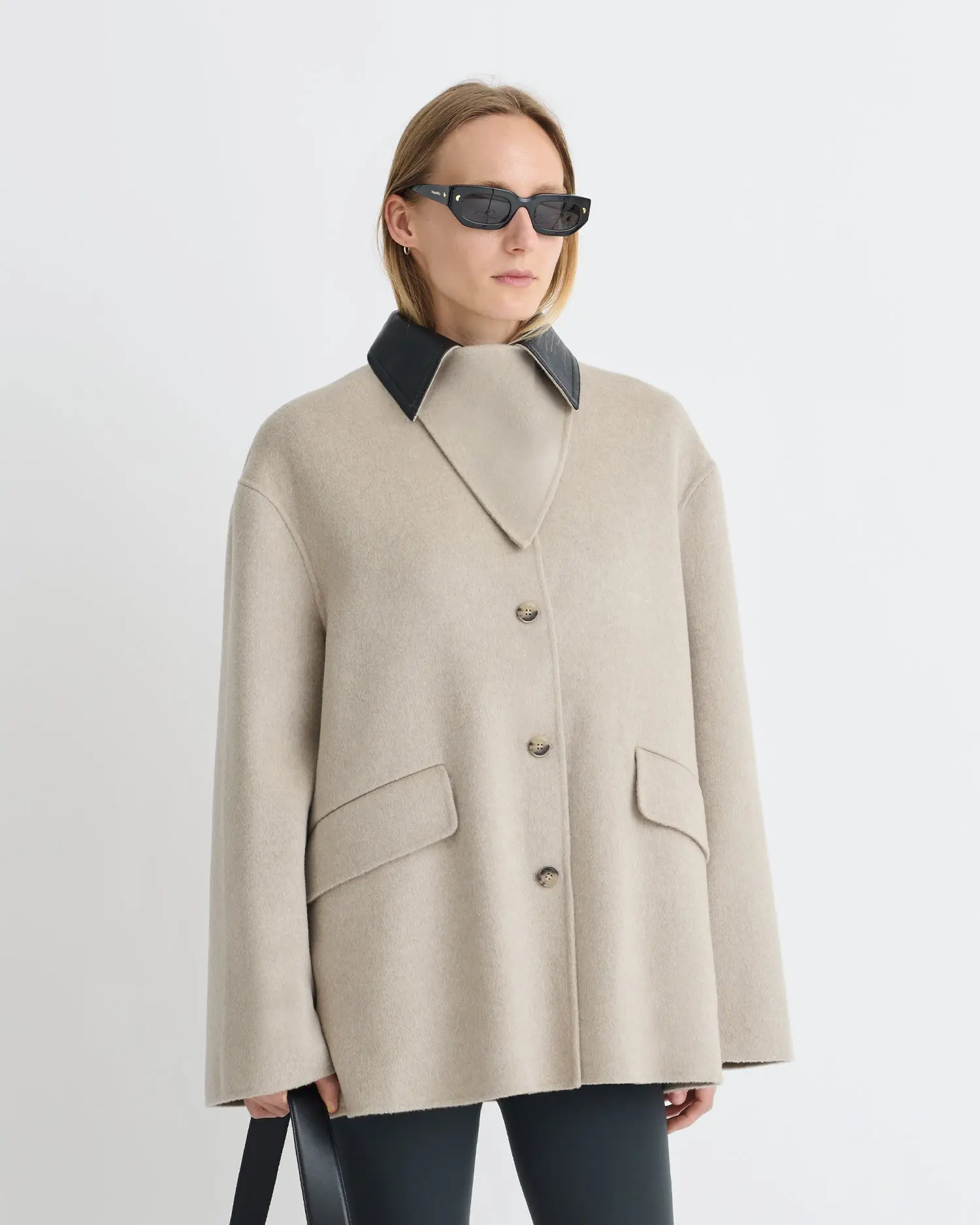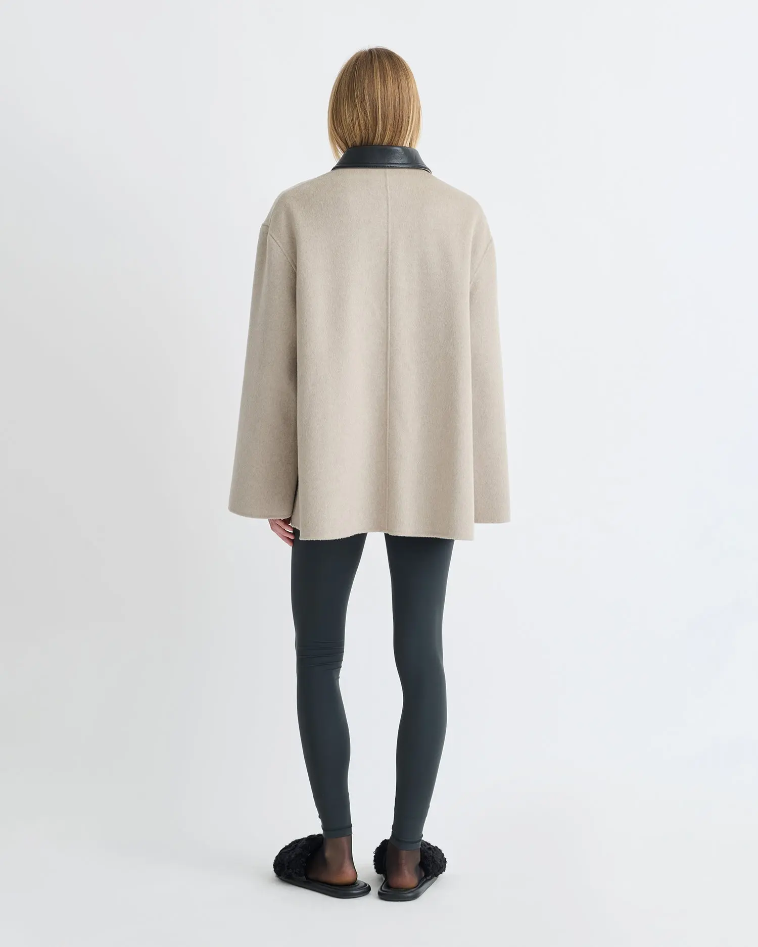 Our Jada Jacket juxtaposes sharp tailoring with an oversized fit. In stone double wool with a black regenerated leather collar.