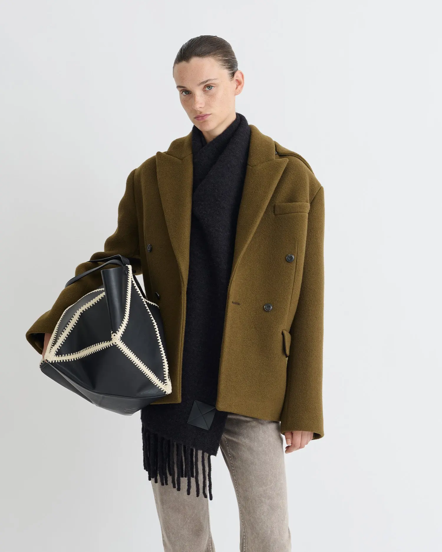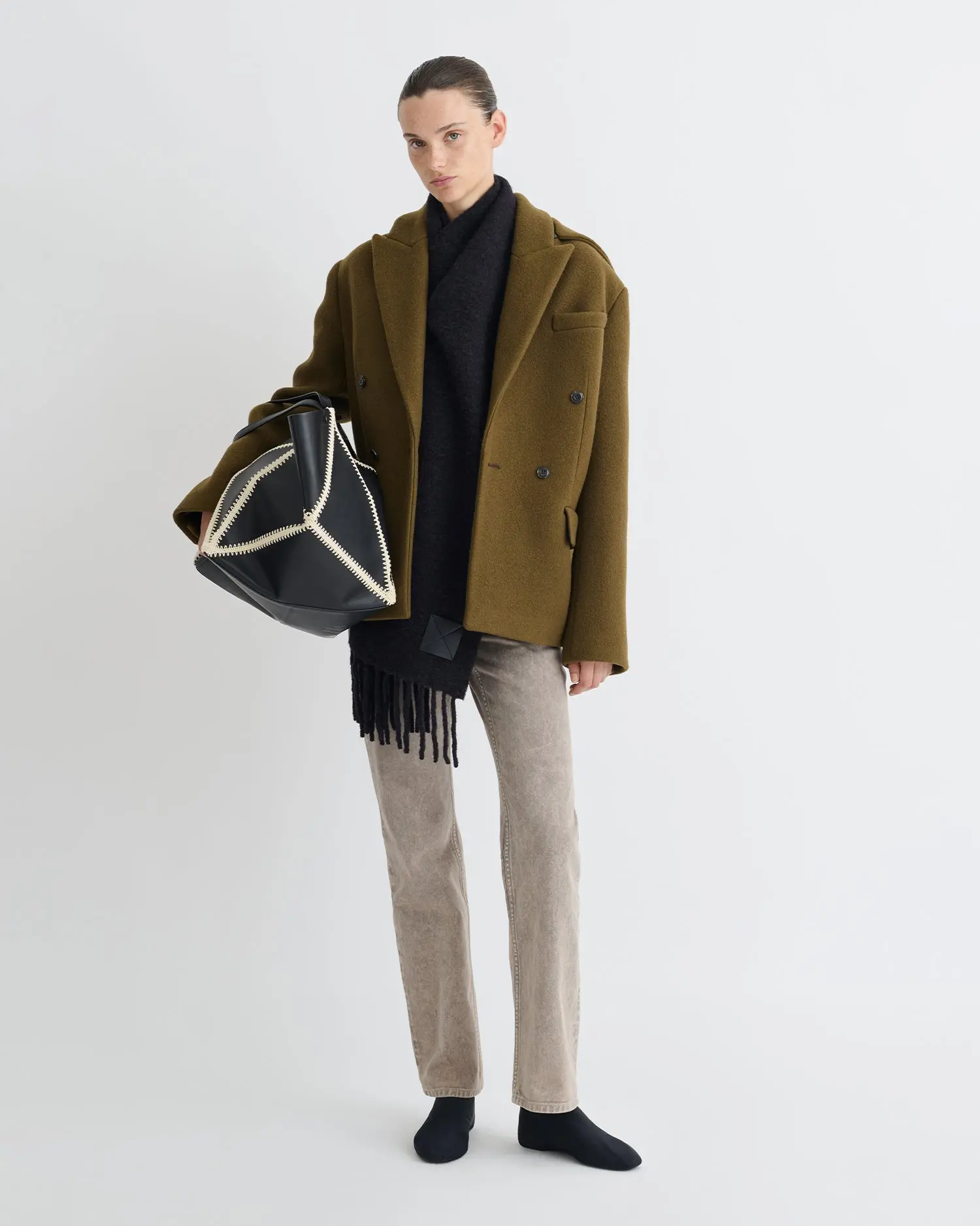 The Brione Blazer is cut from aged felted wool in a brown hue and features a detachable hood and oversized shape. This piece embodies Fall-Winter 25’s approach to injecting transitional tailoring with an architectural edge.