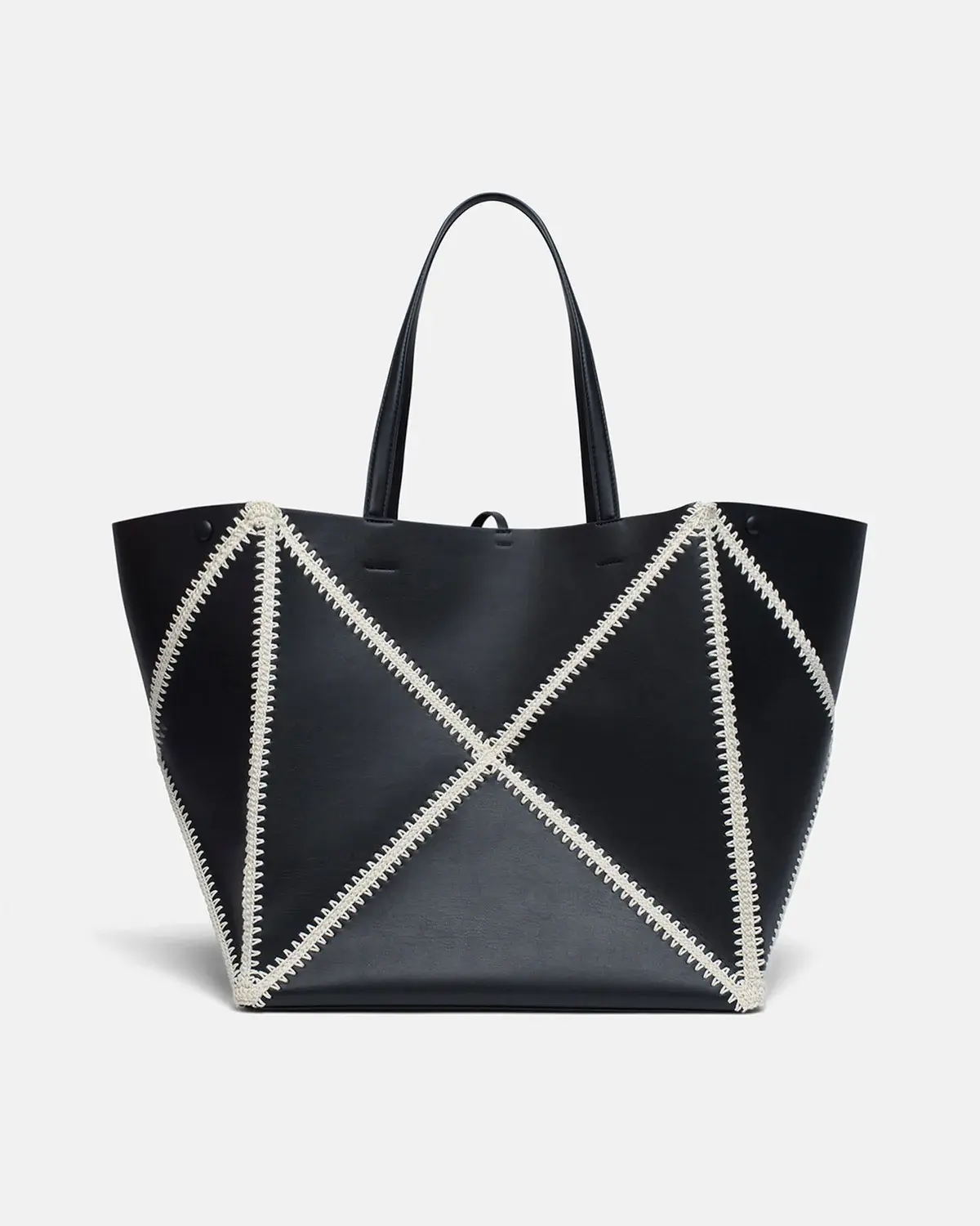 Origami tote folds completely flat to offer a functional solution for storing all your essentials, along with easy-to-carry shoulder straps. It is crafted from soft alt-nappa and detailed with contrast merrow stitching to create a patchwork effect.