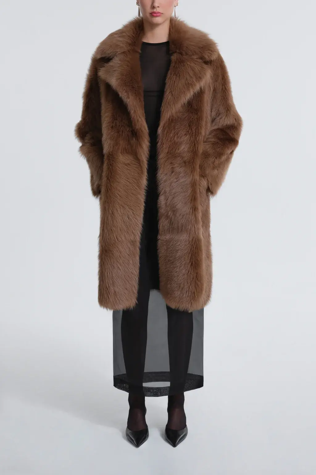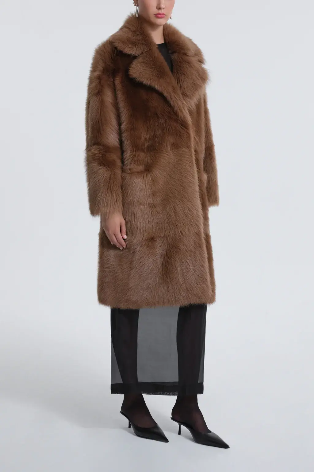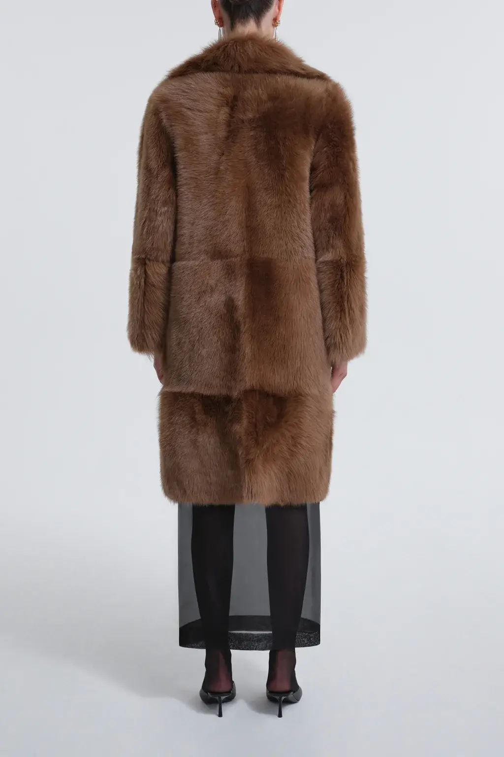 A sumptuous shearling coat inspired by ’90s glamour. Voluminous silhouette in cloudlike shearling. Light in feel, enveloping in warmth.
