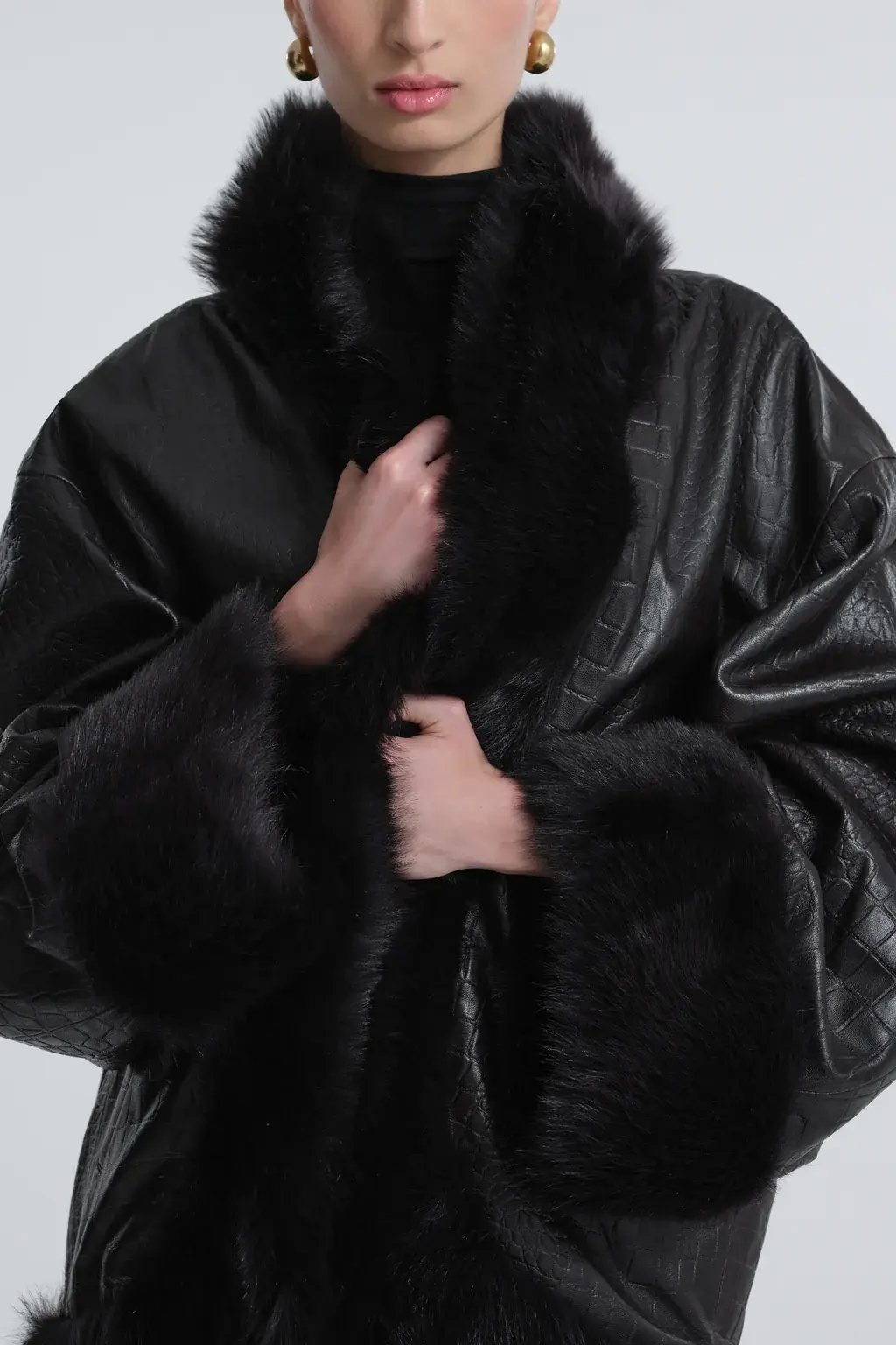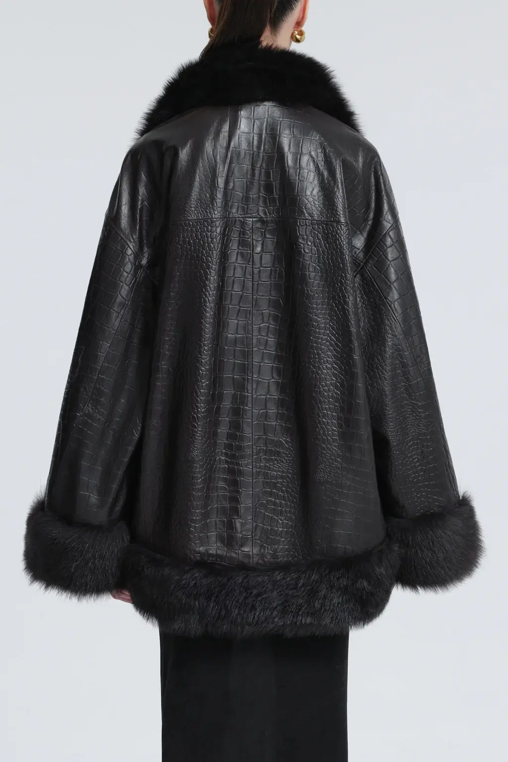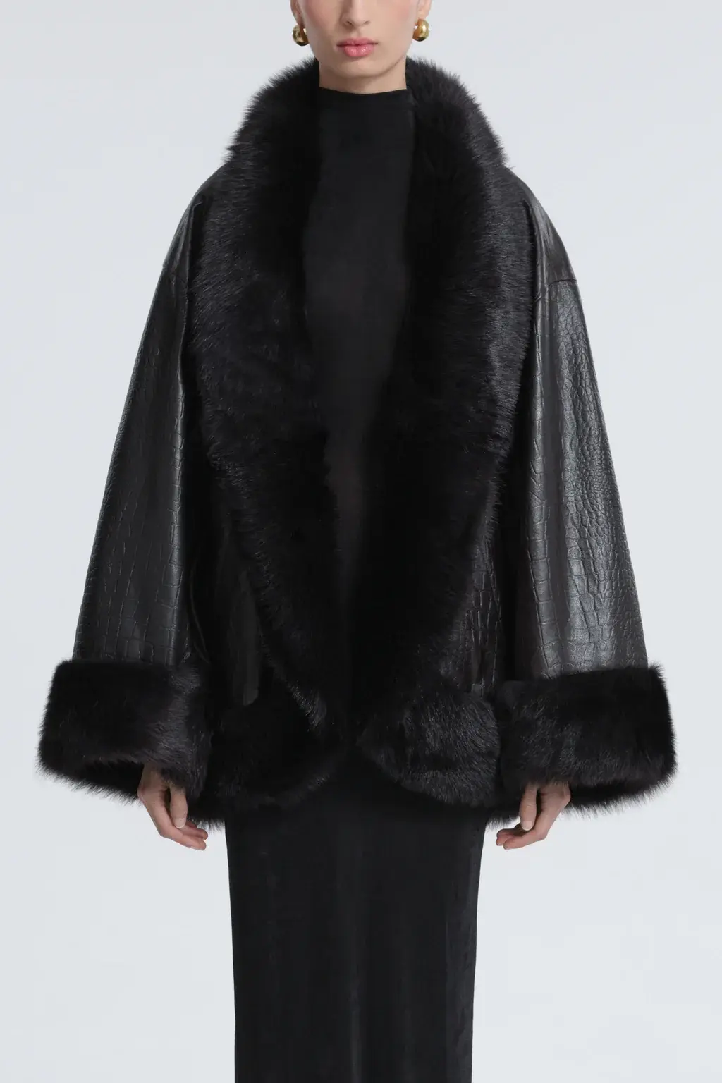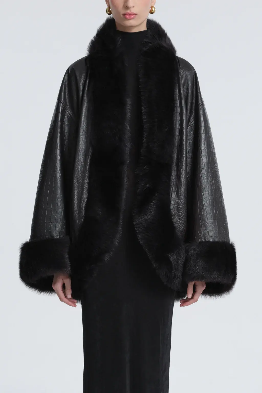 A decadent jacket in croco-embossed leather, trimmed in plush shearling. Defined by a voluminous silhouette with dropped shoulders and wide sleeves. Fastens with discreet hooks or wear open for ease.