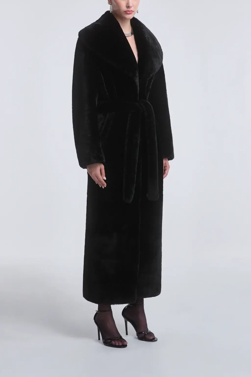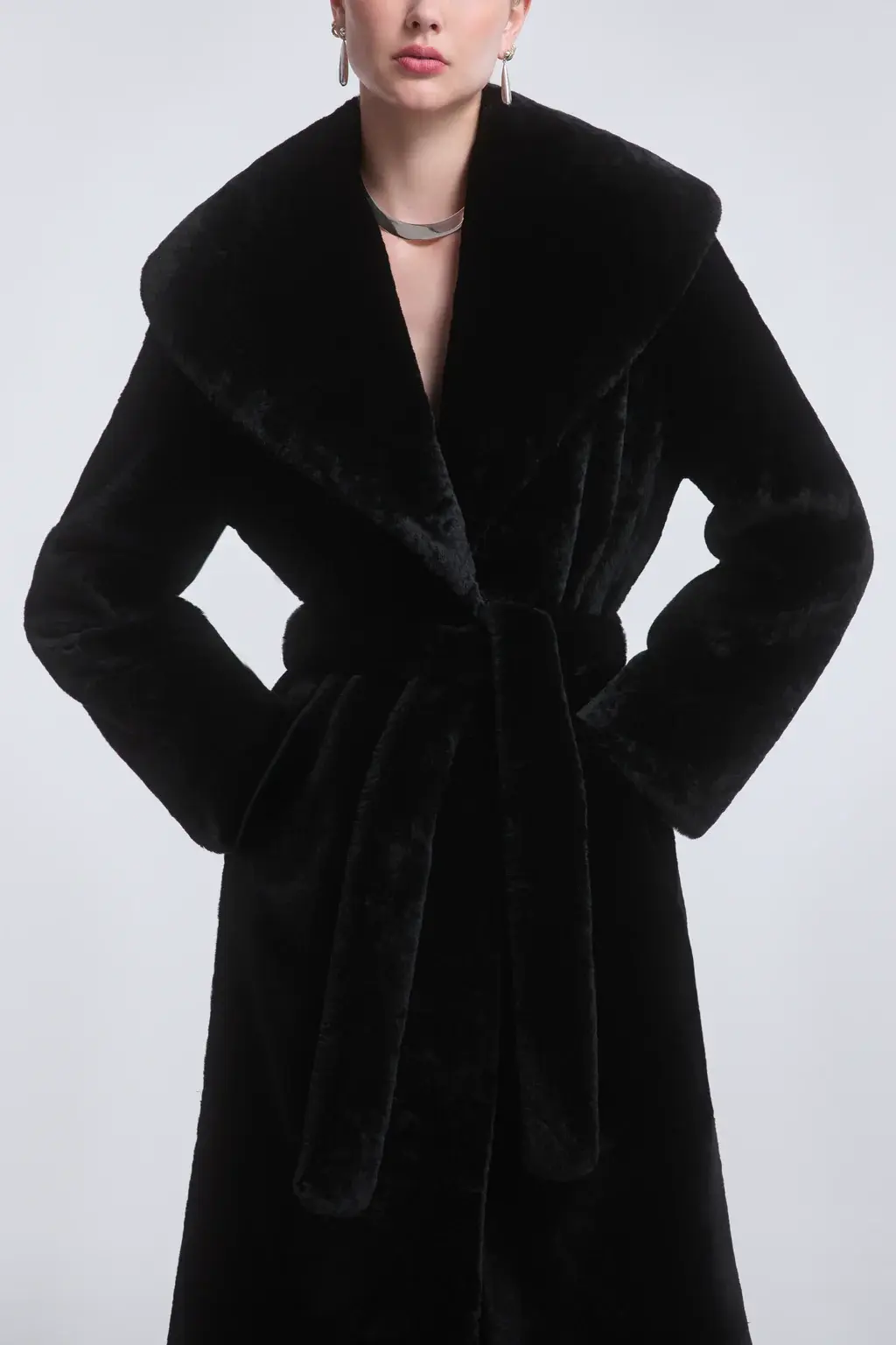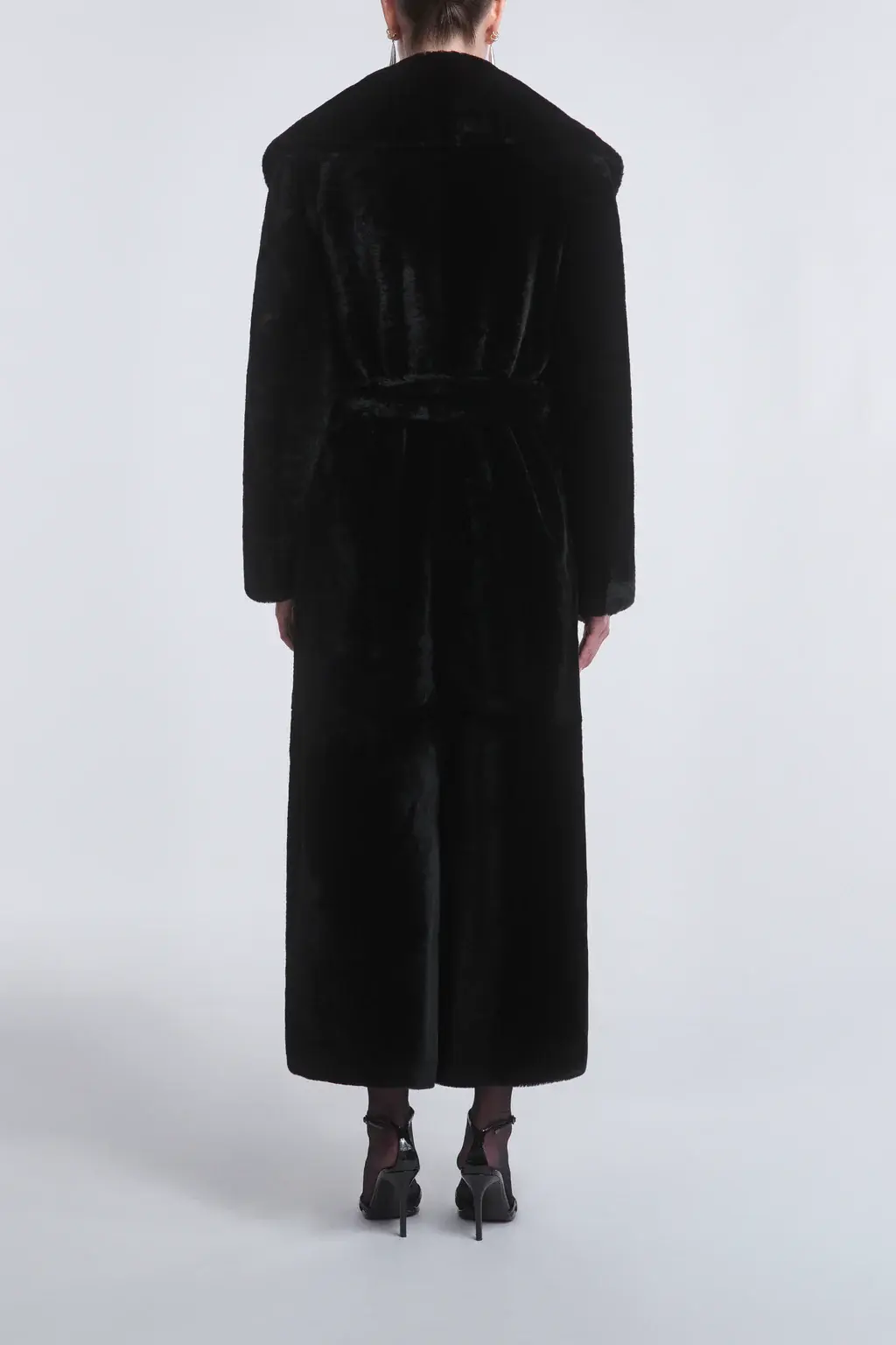 A full-length coat in exceptionally soft shearling. Defined by a wide collar, elongated sleeves, and self-tie belt. An heirloom silhouette with enveloping softness and commanding allure.