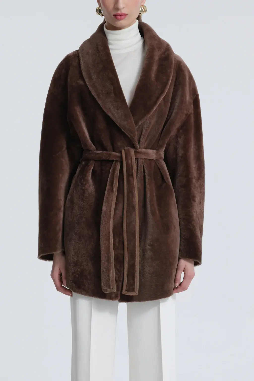 A coat in rich, plush shearling with a lightweight feel. Defined by a belted silhouette that wraps with ease and warmth. An enveloping layer of refined elegance.