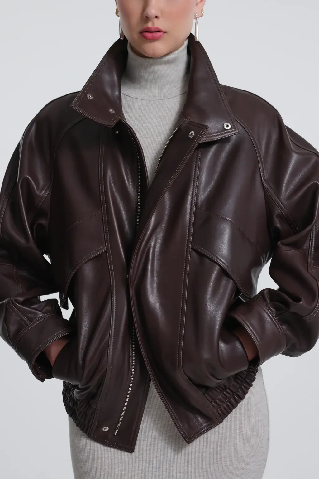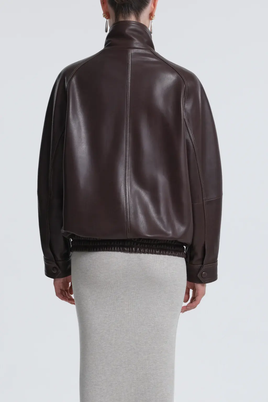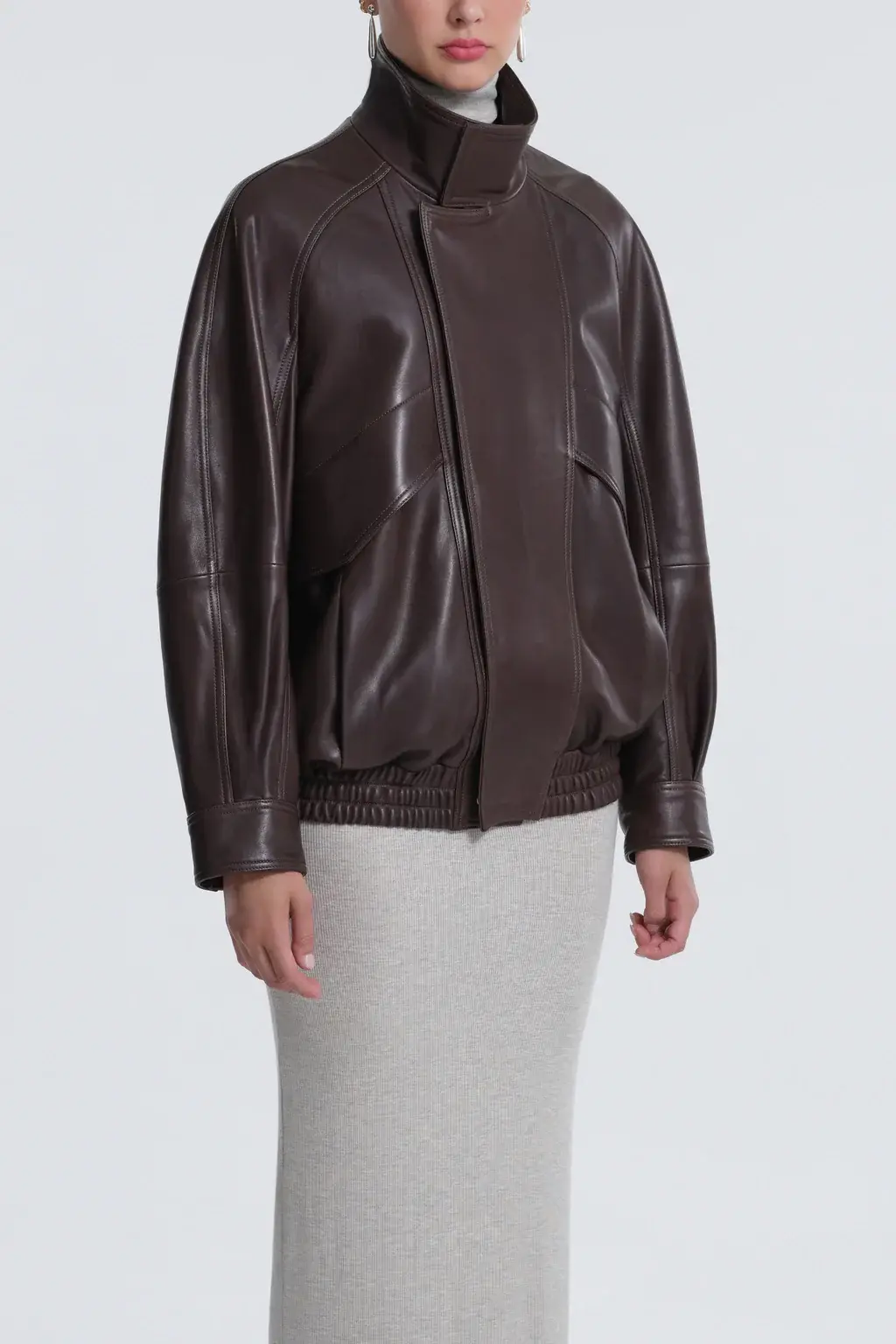 A fluid leather jacket, gracefully enveloping in shape and finish. Defined by a high collar, dropped shoulders, and curved seams. Fastens with zip and button. Softly cinched at hem.