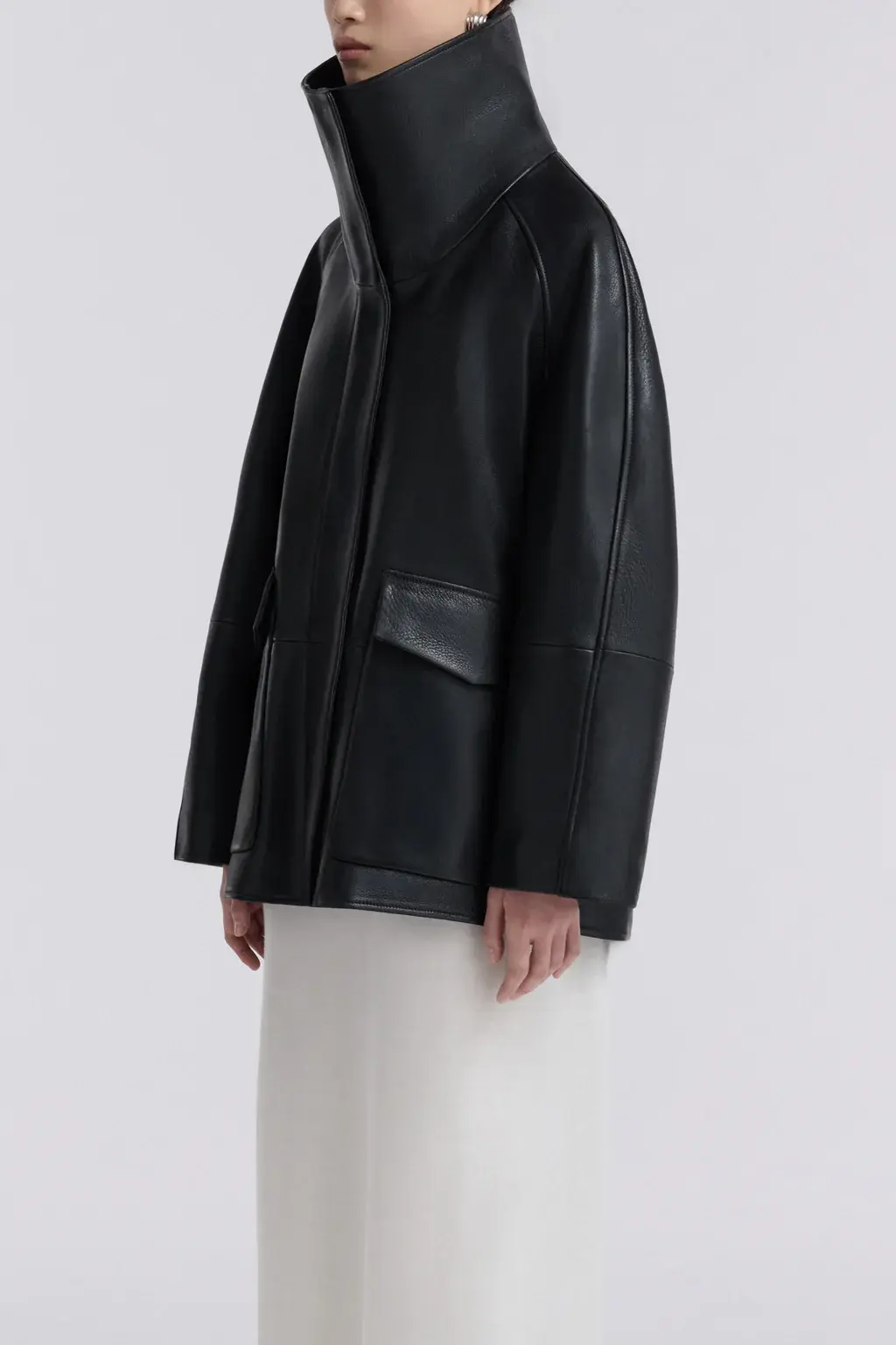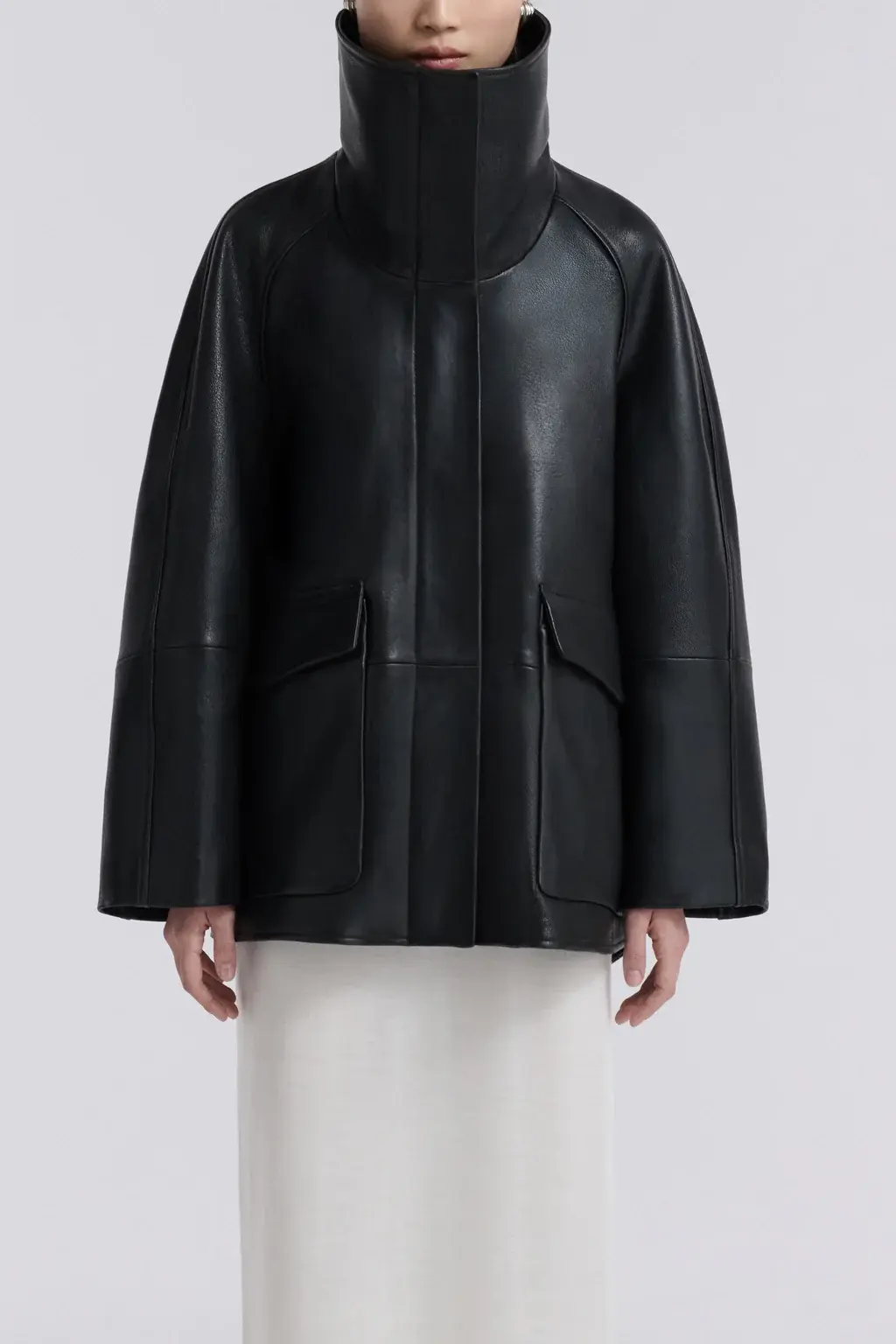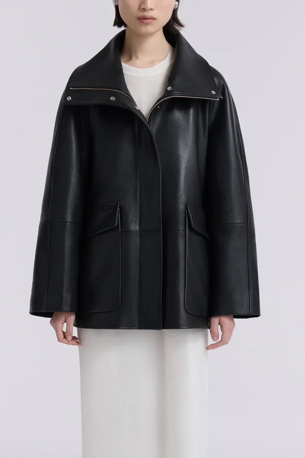 A high-neck leather jacket cut in supple, lightly grained lambskin with a fluid fall. Designed with a sculpted funnel collar, dropped shoulders, and generous sleeves. Finished with concealed snap closures and oversized patch pockets.