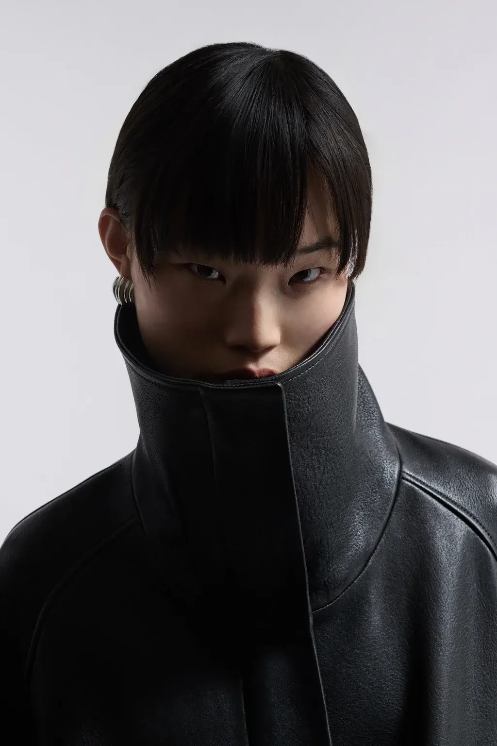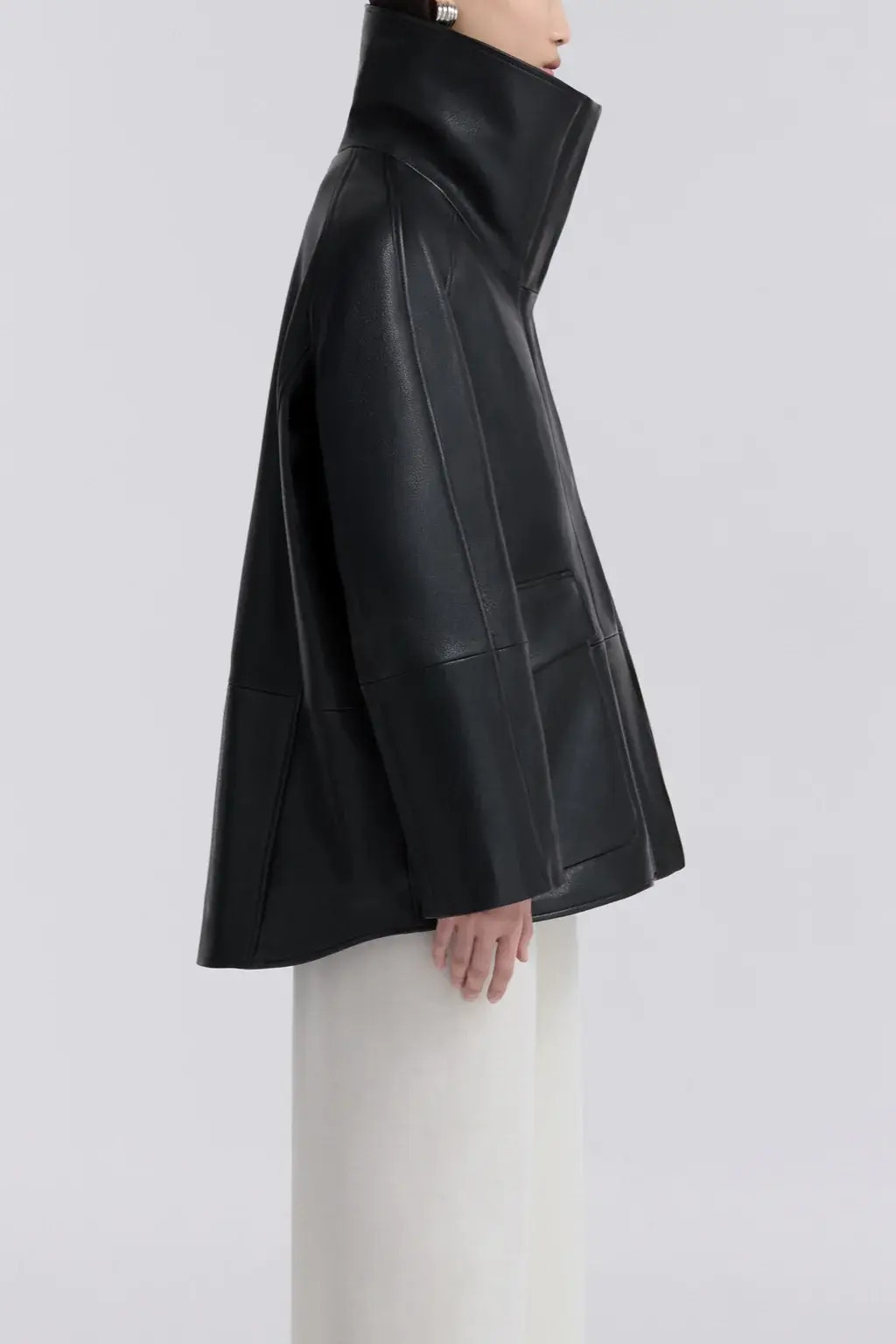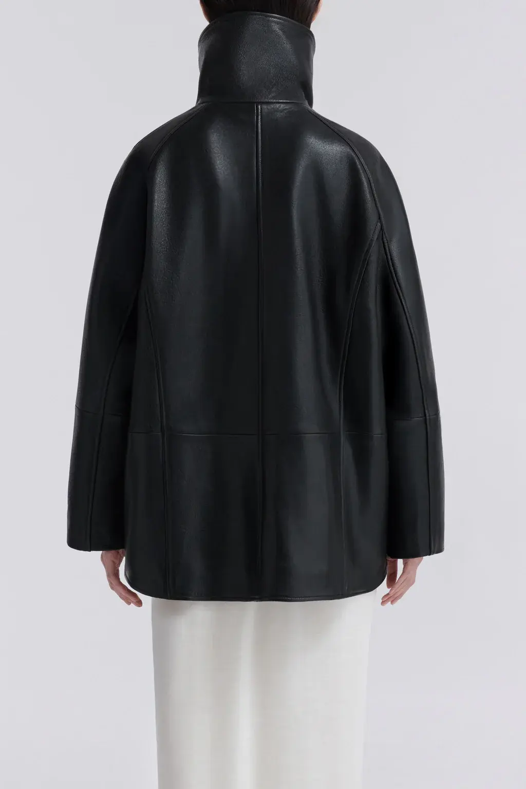 A high-neck leather jacket cut in supple, lightly grained lambskin with a fluid fall. Designed with a sculpted funnel collar, dropped shoulders, and generous sleeves. Finished with concealed snap closures and oversized patch pockets.