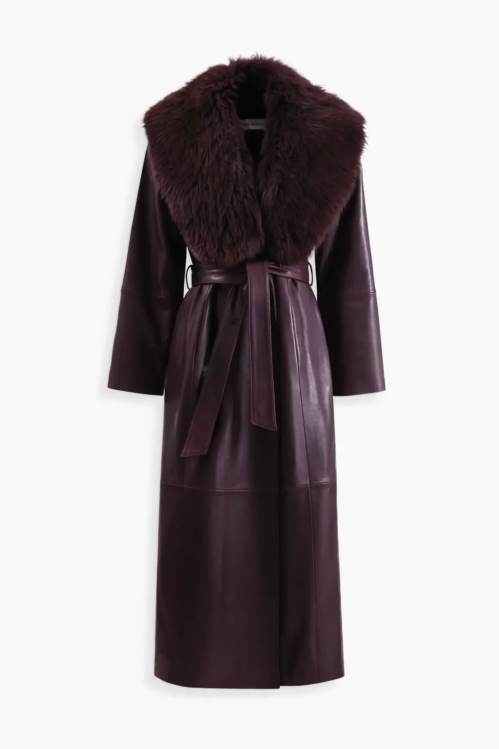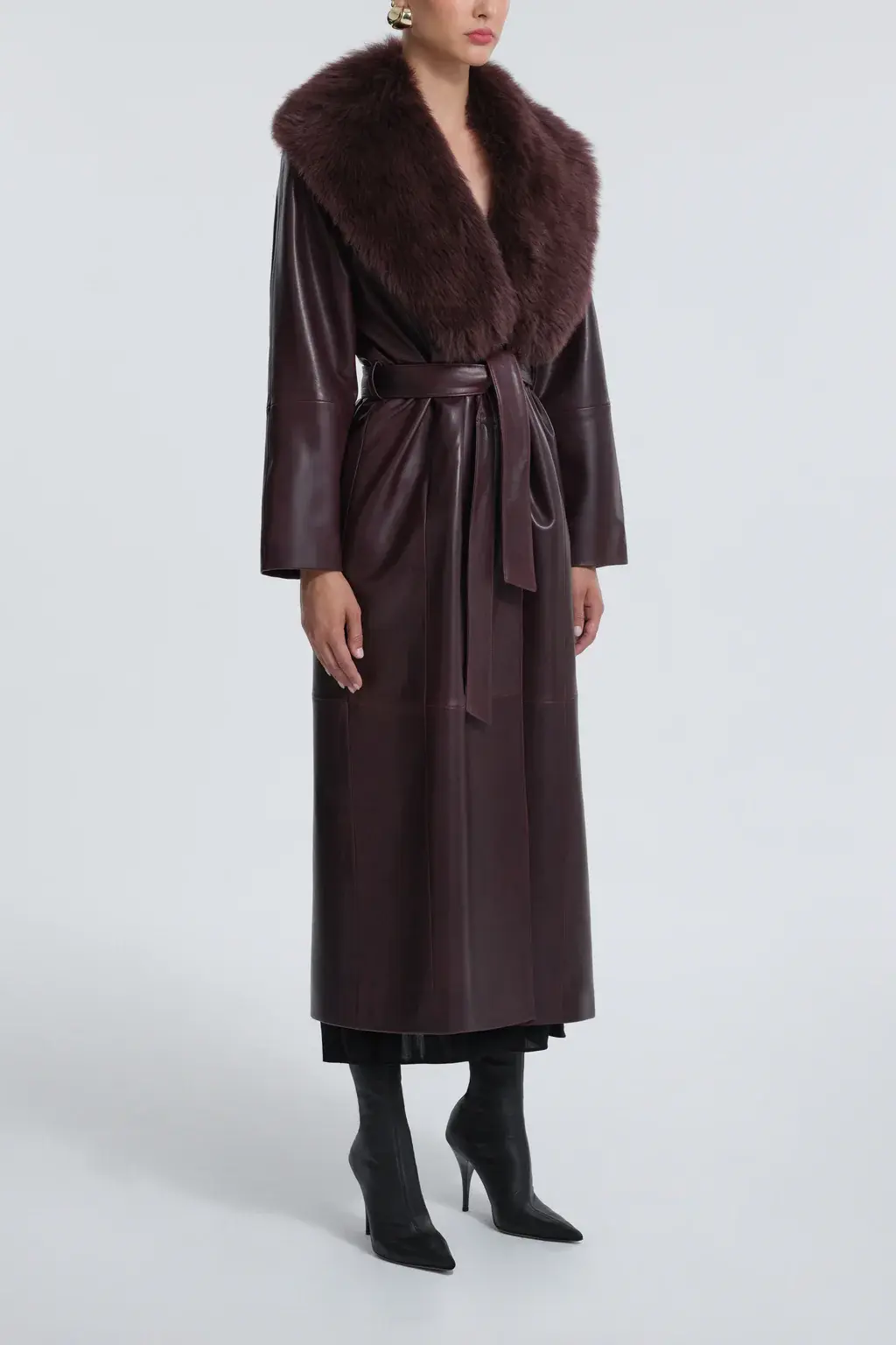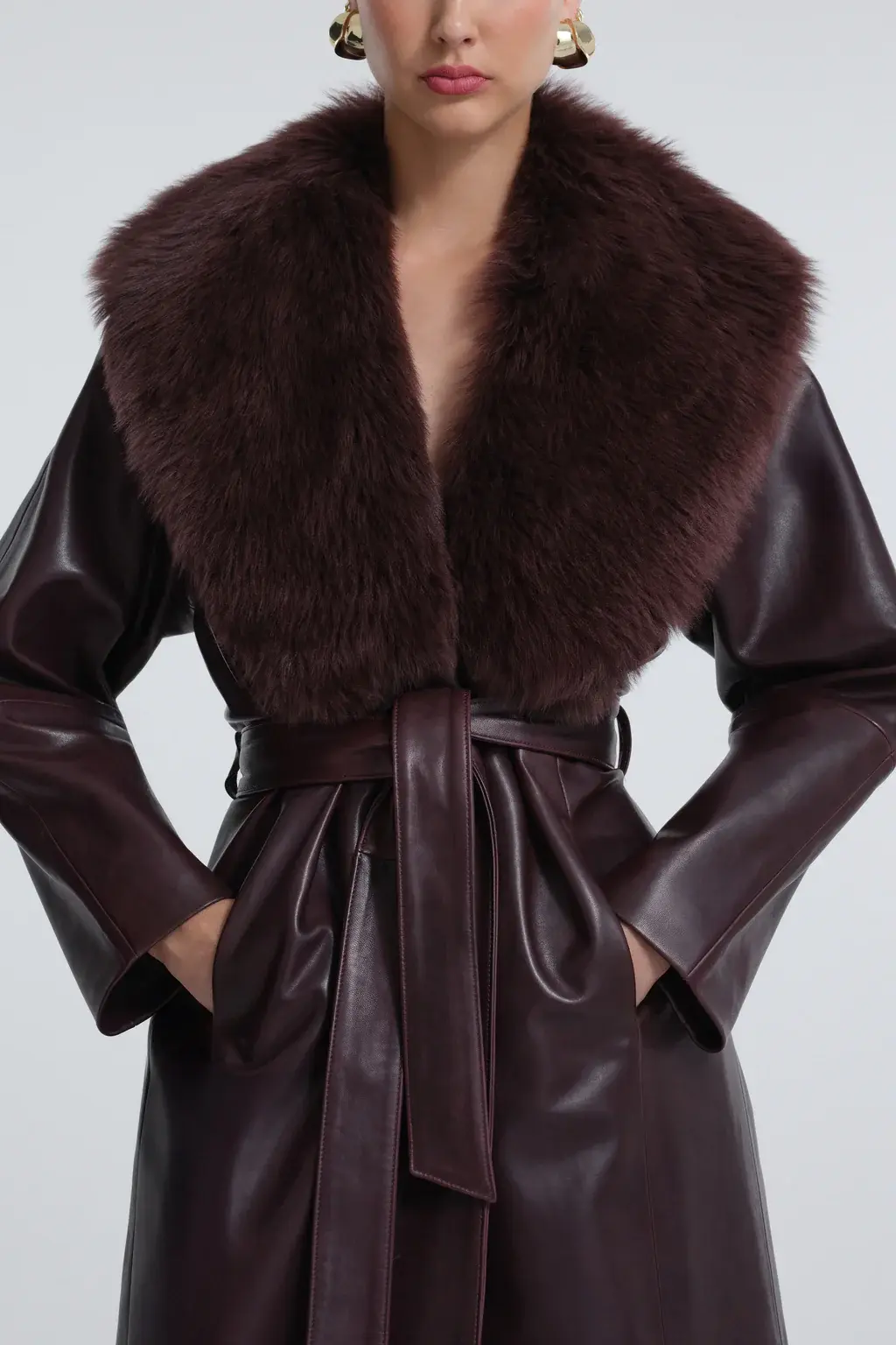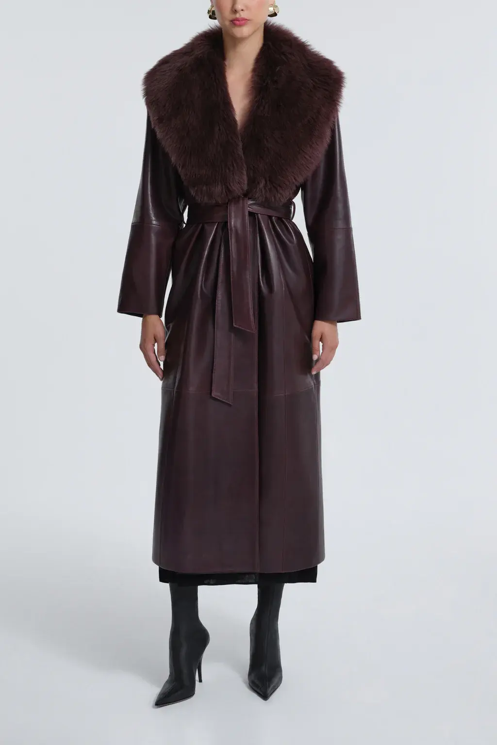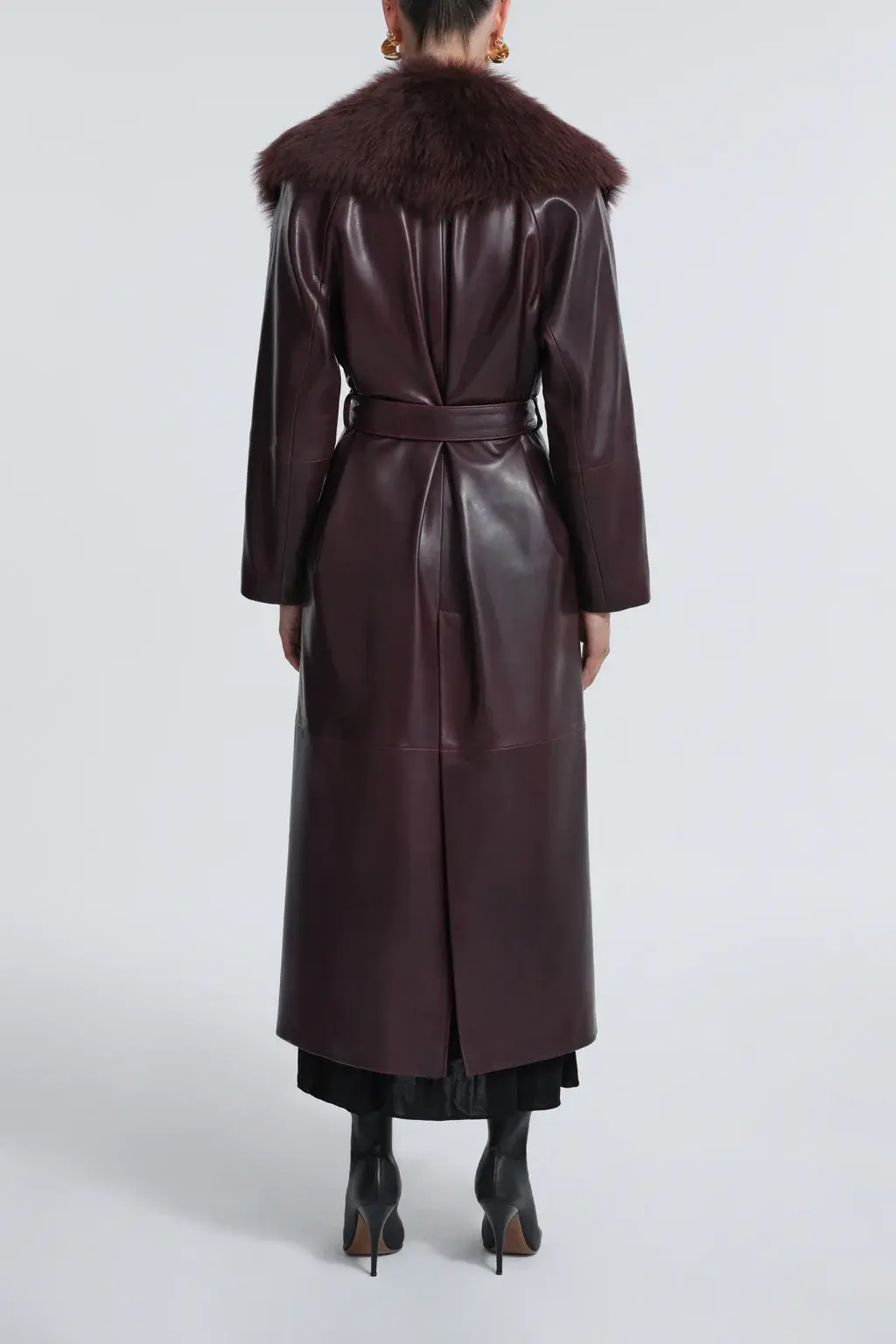 An elegant longline coat in soft leather, with a relaxed sensuality. Featuring a plush removable shearling collar, a belted waist, and a back slit that allows for effortless movement.